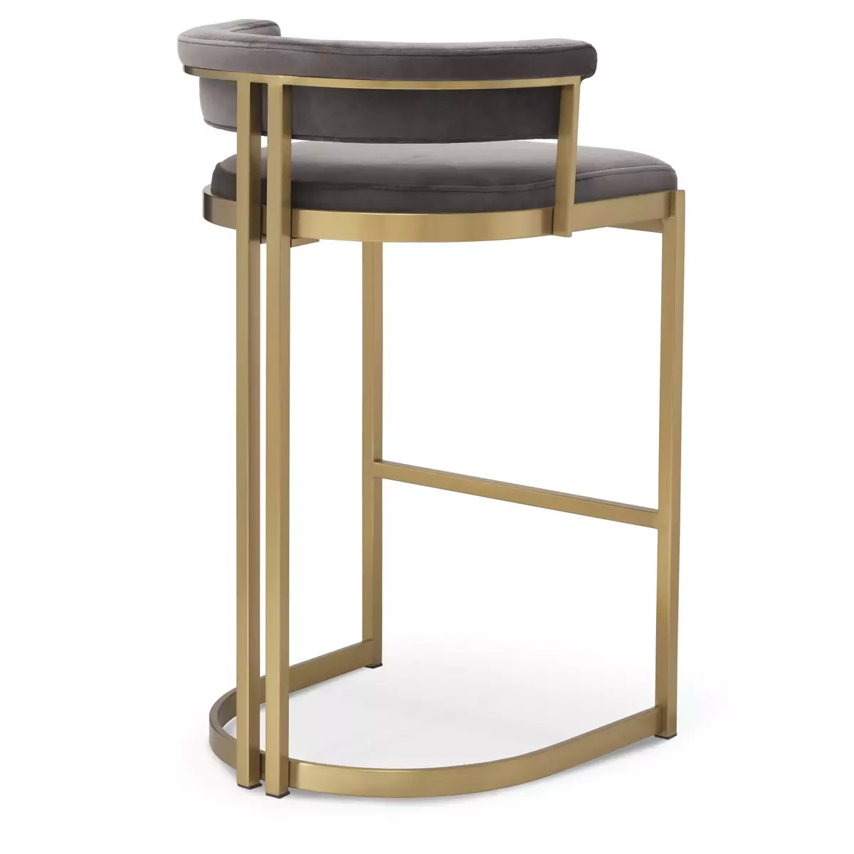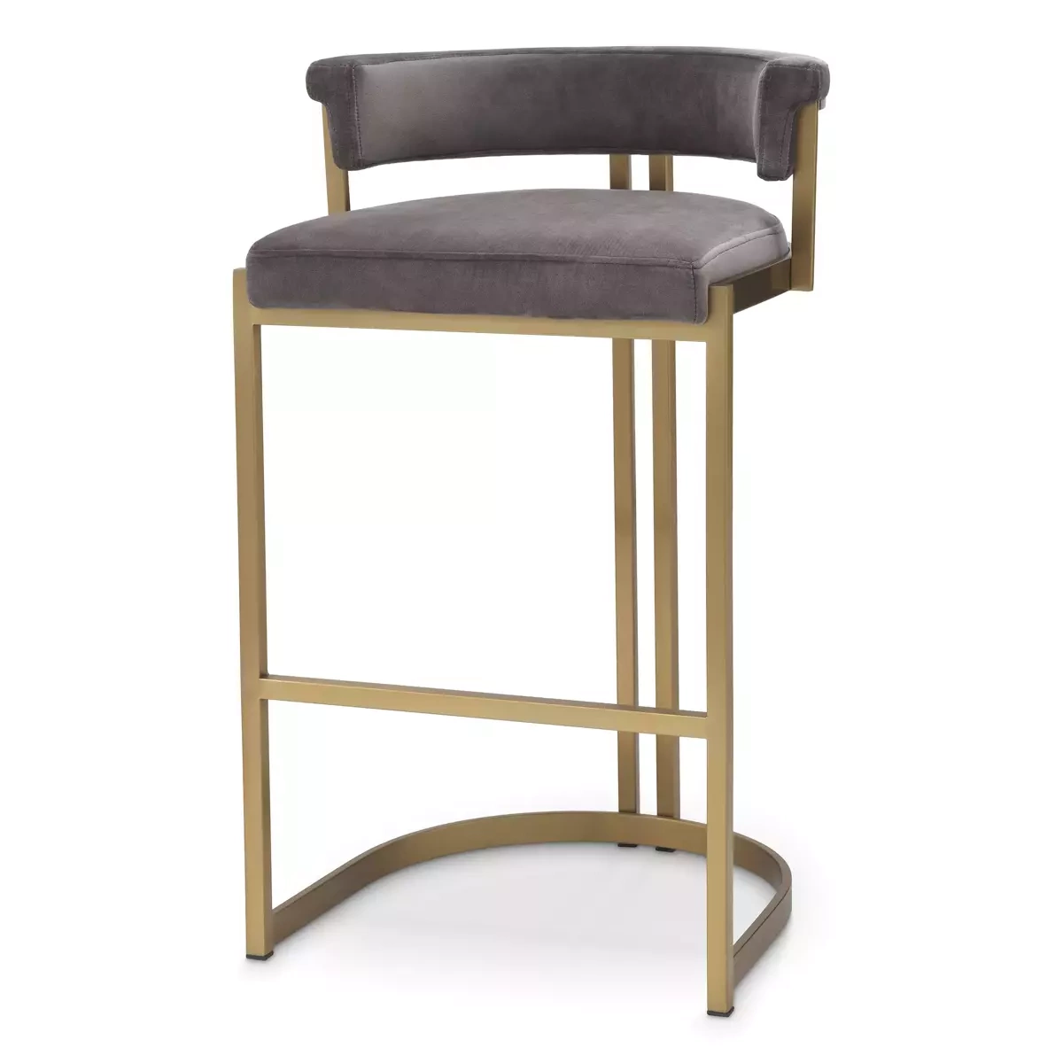 The Dante bar chair by Eichholtz is made of brushed brass and finished in Savona grey fabric. Dimensions: A. 48,5 | B. 46,5 | C. 81 | D. 43 | E. 67.5 cm.
