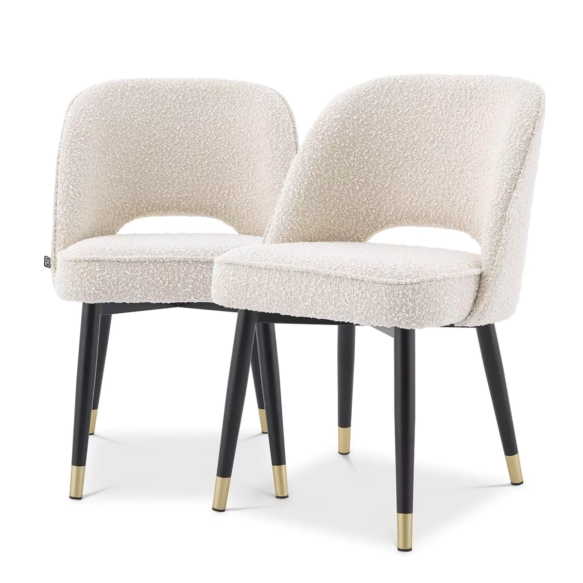 - The Cliff 2 chair by Eichholtz is made of bouclé cream velvet and finished with black legs with brass details. The set includes two chairs.