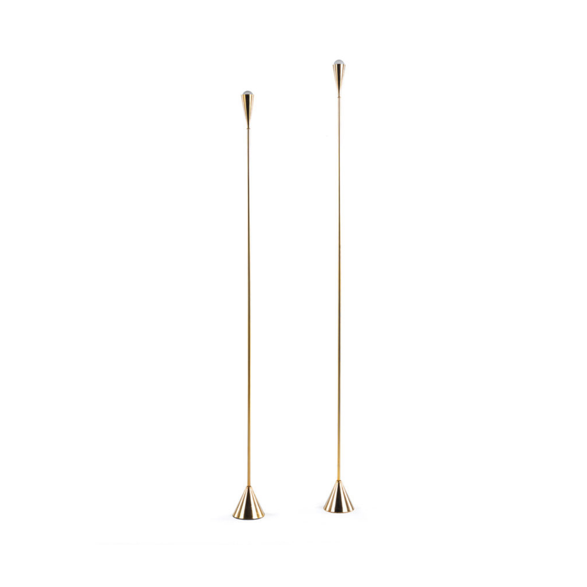 The Illicio floor lamp by Gianfranco Ferré Home features a brass and iron structure with a gold finish. Dimensions: 13 x 13 x 173 cm