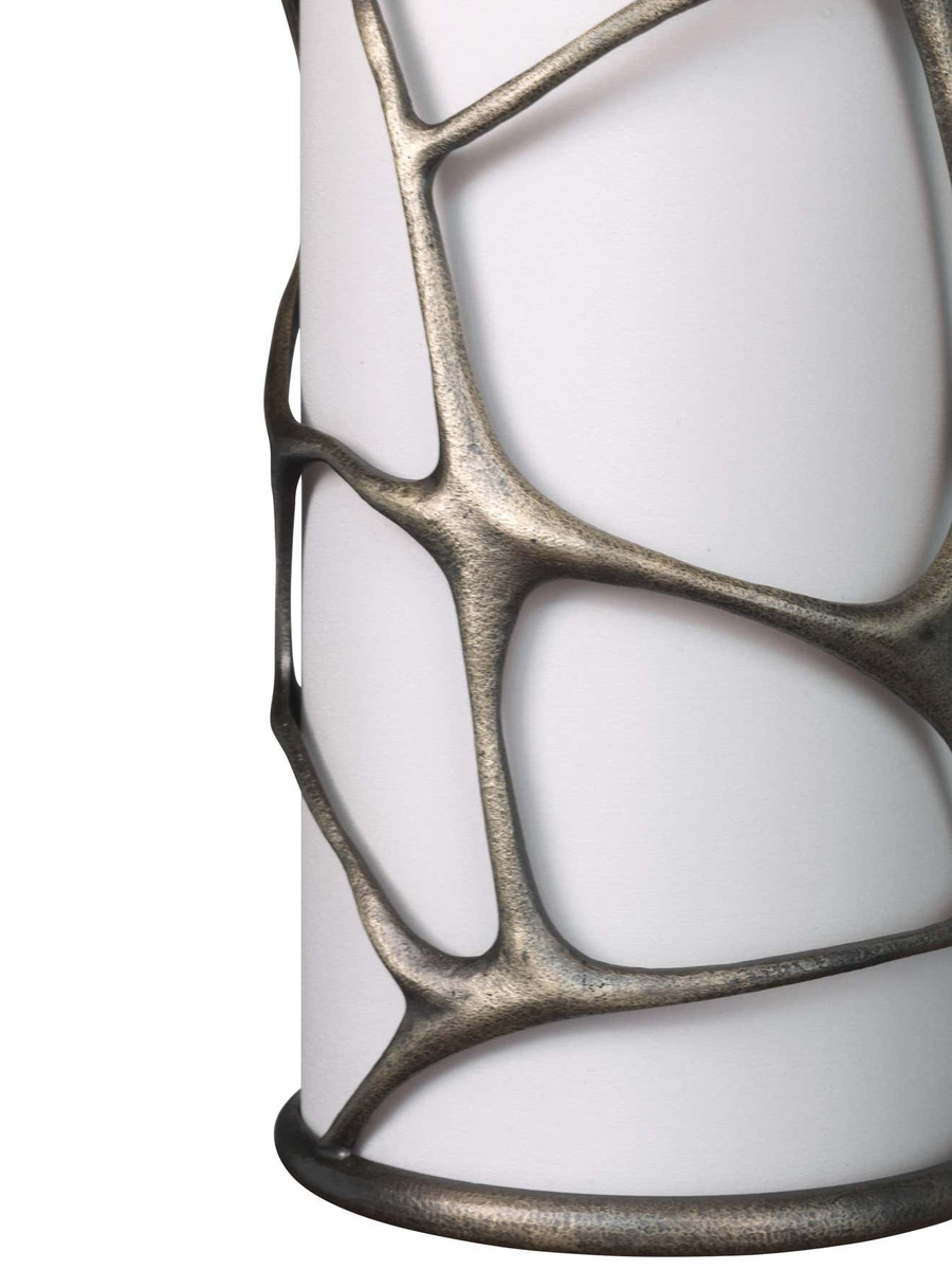 The Sioraf chandelier by Roberto Cavalli Home Interiors features brass construction in forged gold, forged dark bronze or matte black. The fabric lampshade in Ivory. Dimensions: ø 20 x h 47 cm.
