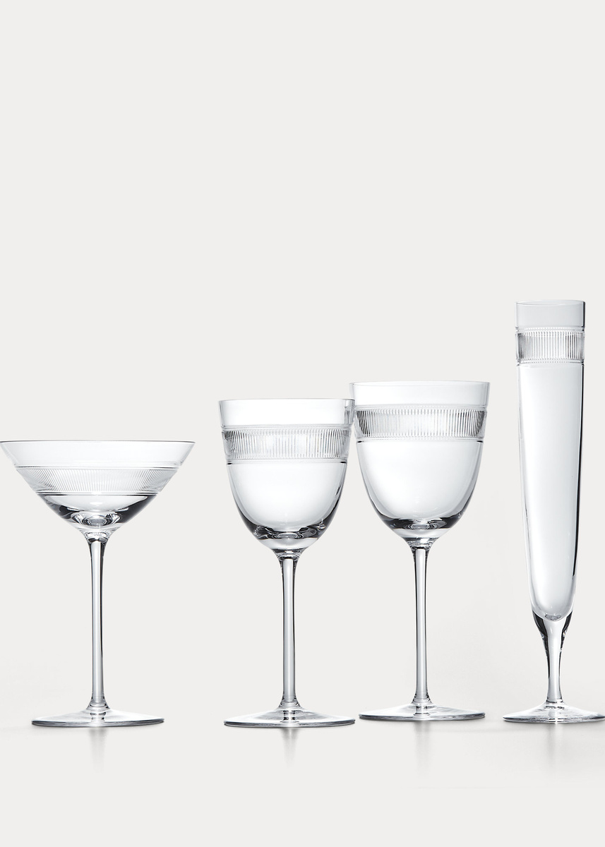 The delicate cuts that accent our Langley glassware are inspired by the coin-edge detailing of a classic Ralph Lauren watch. Crystal glass affords each refined piece weight and a high-clarity finish.