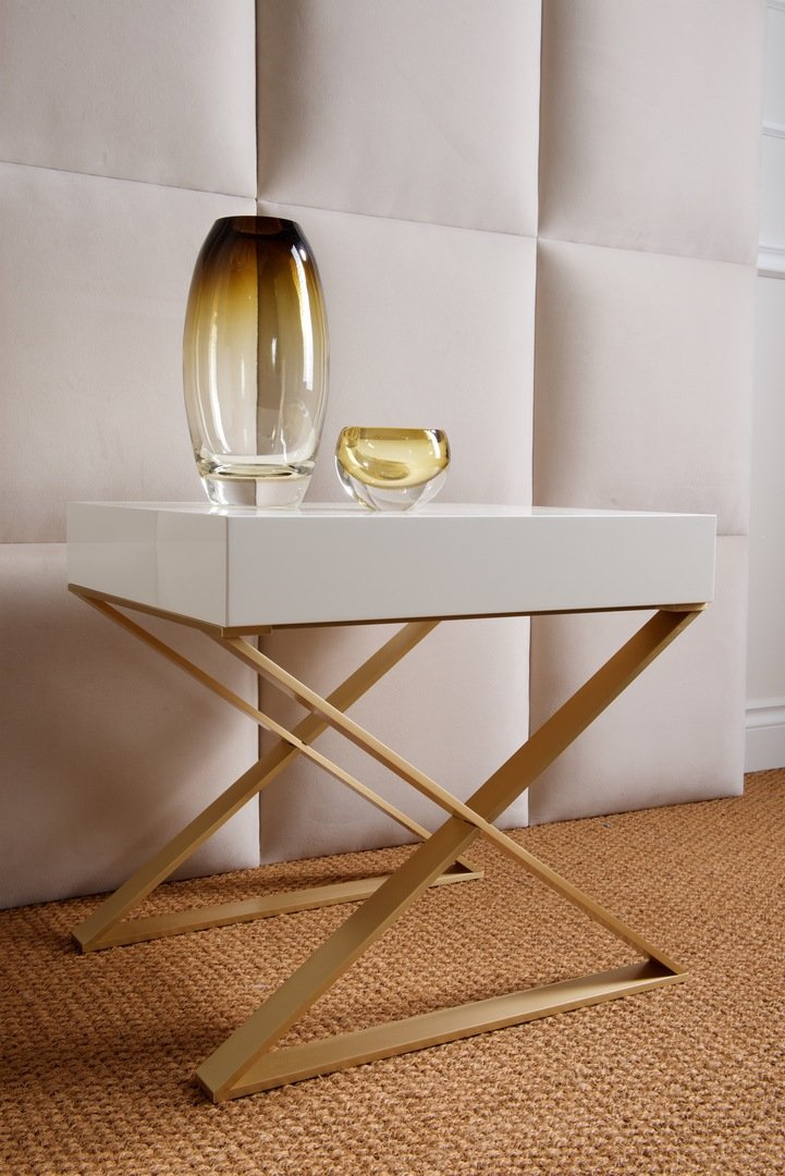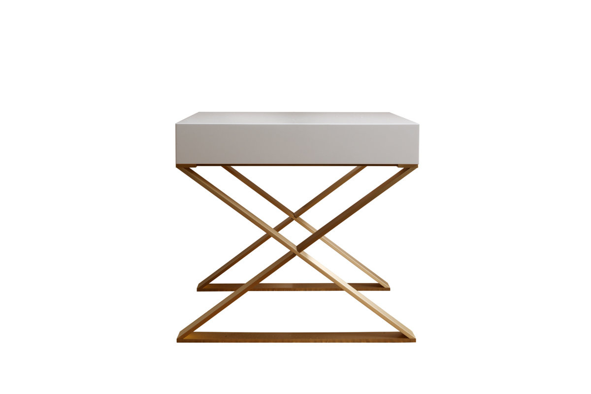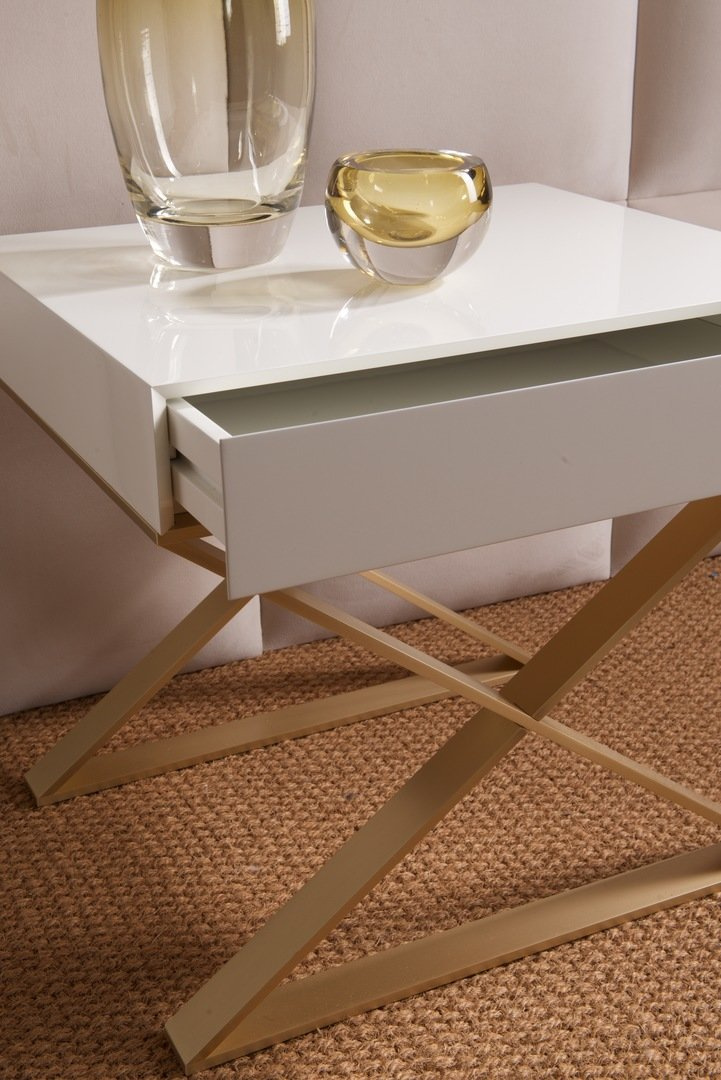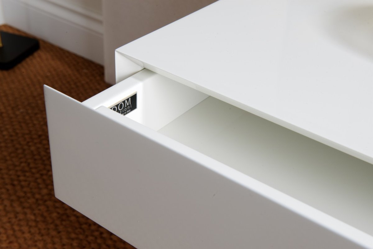 - The Marino bedside table by Dom Edizioni is made of a metal base and finished in white color. The cabinet has one drawer.