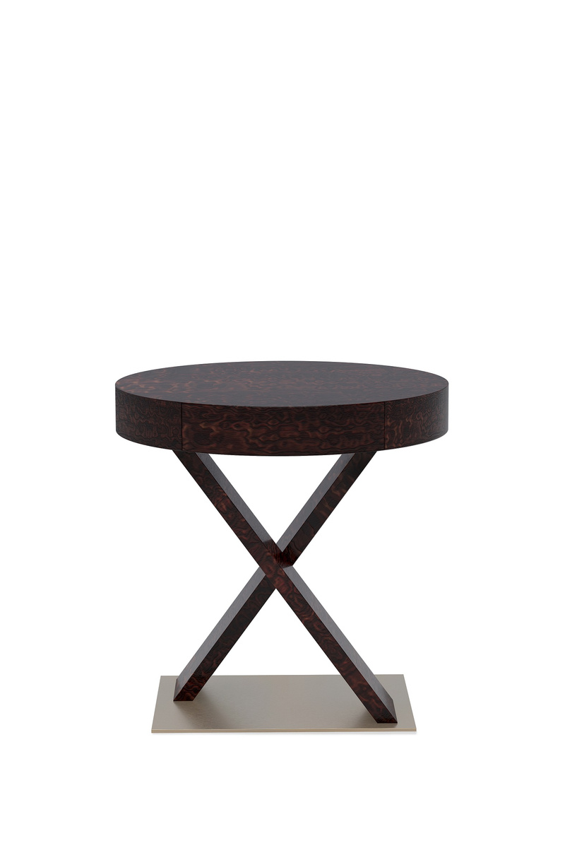 The Cimarosa table by Armani Casa is made of brown mahogany and finished in brass. The table has a drawer. Dimensions: 50 x 50 cm.