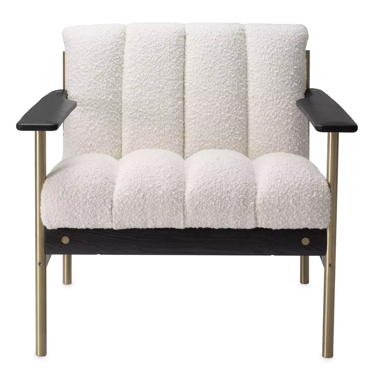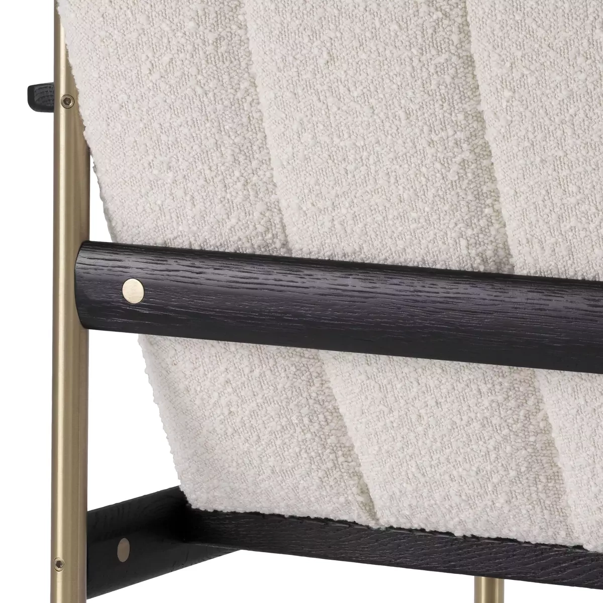 - Elan armchair by Eichholtz is made of Bouclé cream fabric and finished in brushed brass.