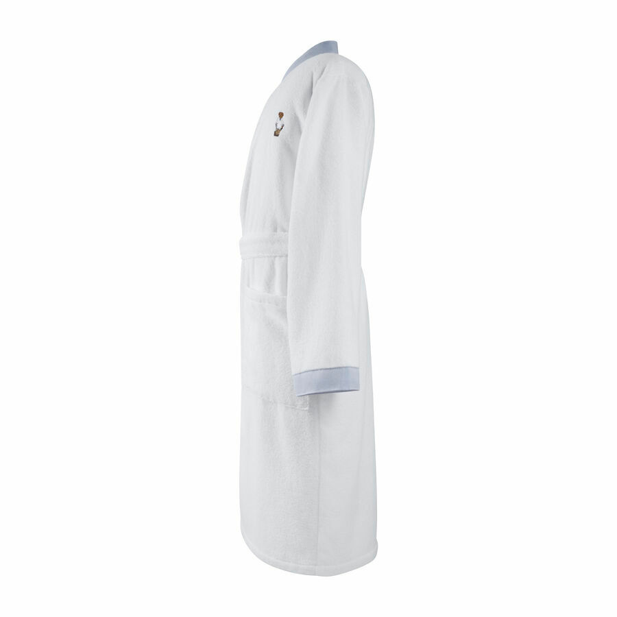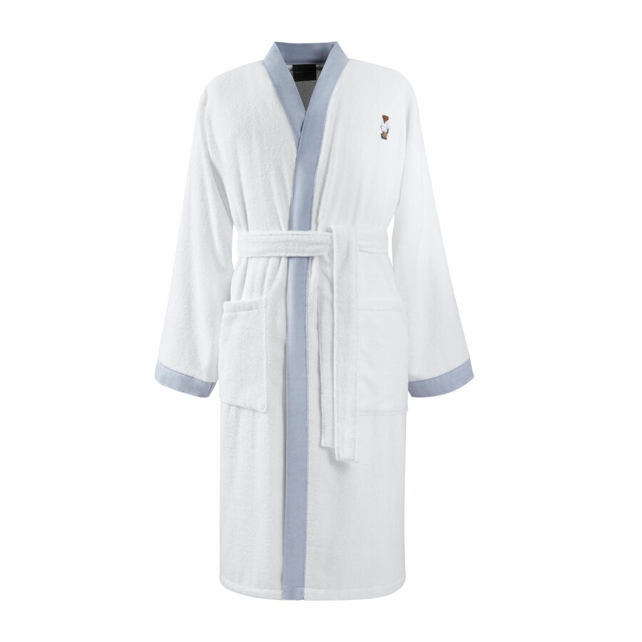 - The bathrobe by Ralph Lauren Home, from the Doleman collection, is made of 100% Egyptian cotton 380gr/m² and finished in white with blue details. The bathrobe has an embroidered teddy bear on the front.