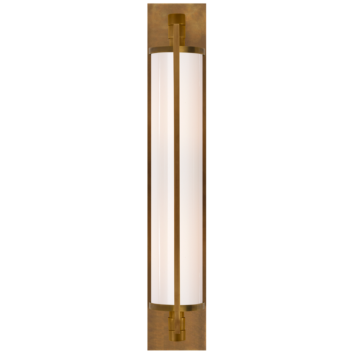 - The Keeley bathroom wall lamp by Thomas O'Brien is made of hand-brushed brass and finished with milk glass.