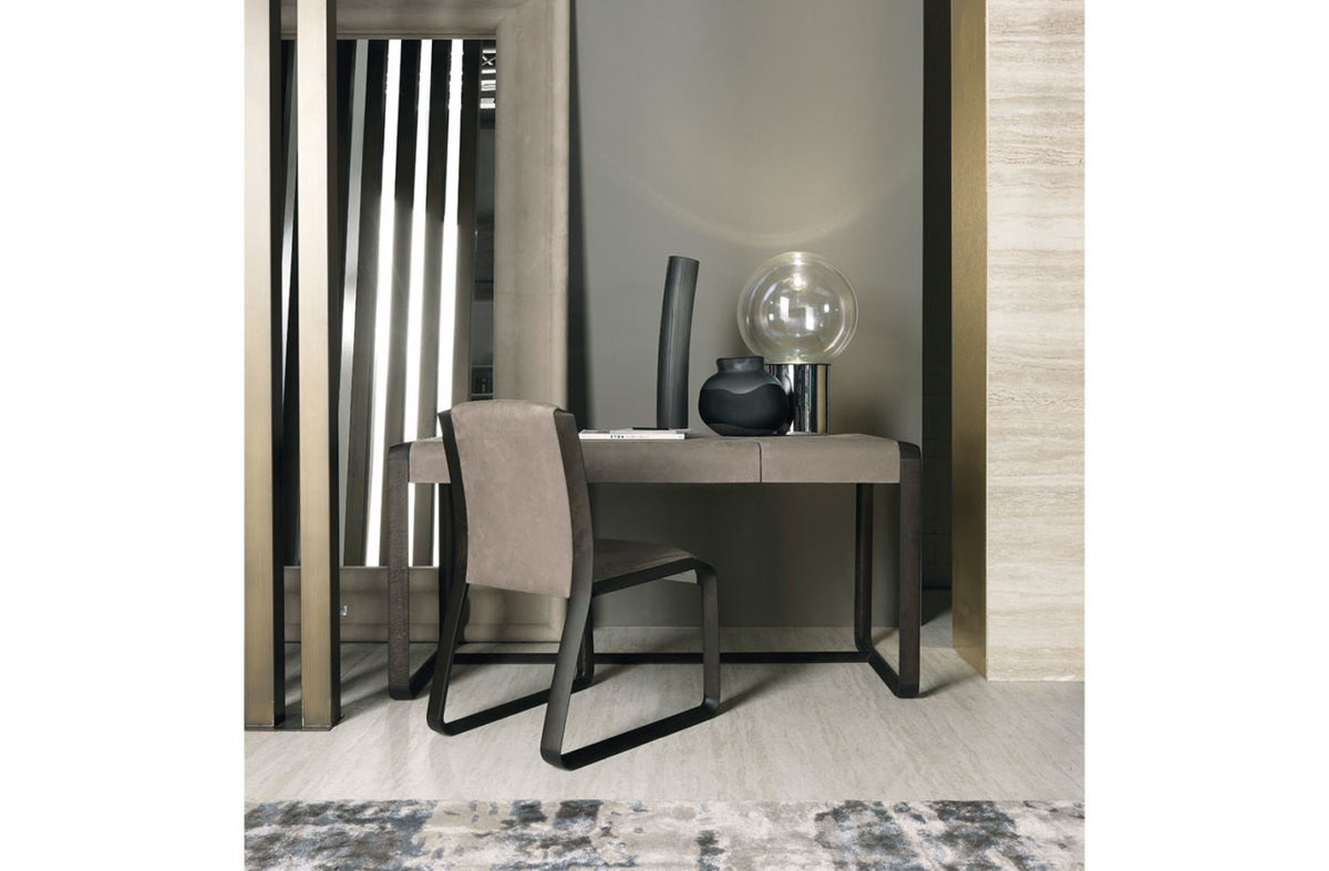 The Wynwood chair by Gianfranco Ferré Home features a Smokey Grey stained solid beech wood construction with variable cross-section, irregular curves and finger joints using CNC technology, mounted on a panel with extendable pegs. Seat frame with panels of curved multi-ply wood and elastic webbing, padded with polyurethane foam and dacron. Back panel in curved multi-layer wood, padded with polyurethane foam. Upholstery in fabric or leather from the collection.