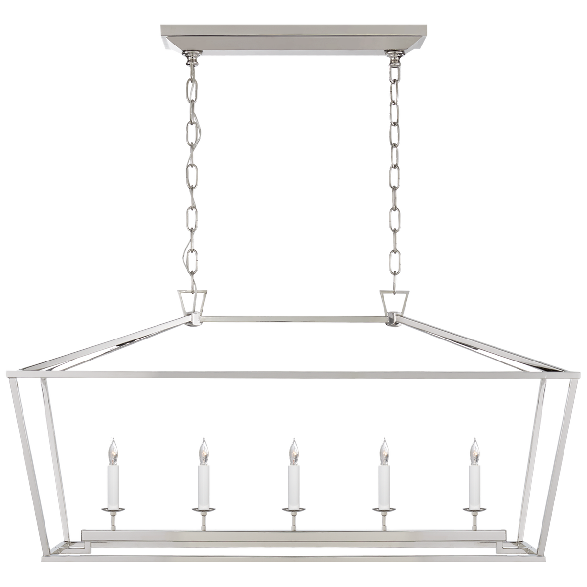 The Darlana Medium pendant lamp by Chapman & Myers in polished nickel combines classic proportions with a modern lightness. The open steel frame and offset corners lend elegance. Dimensions: H 50.8 x W 33.02 cm x D 104.1 cm