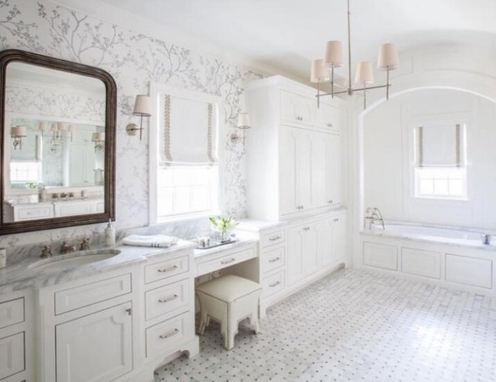 - Bryant Small chandelier by Thomas O'Brien by Visual Comfort in polished nickel with linen lampshades.