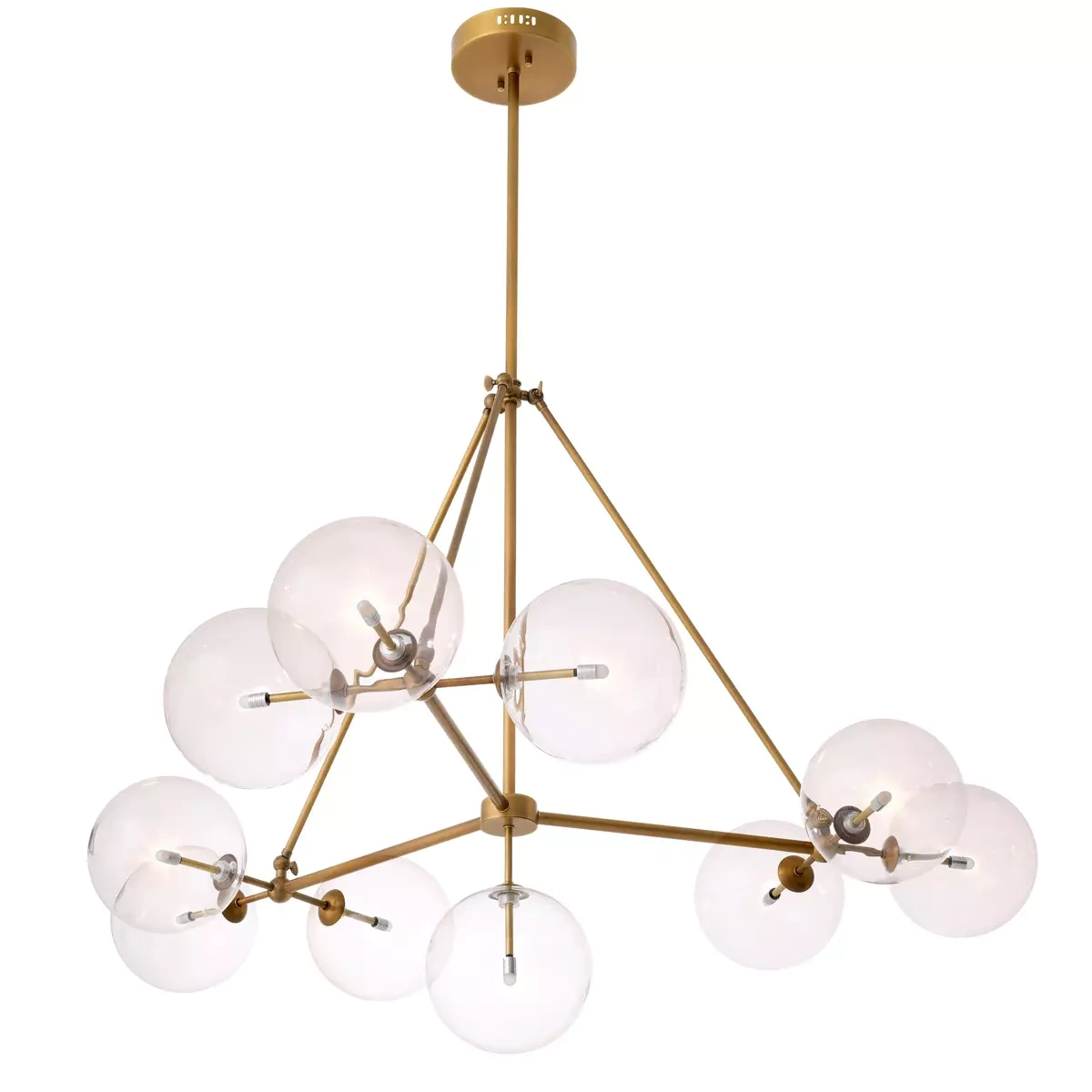 - The Bermuda chandelier by Eichholtz is made of antique brass and finished with bright glass.
