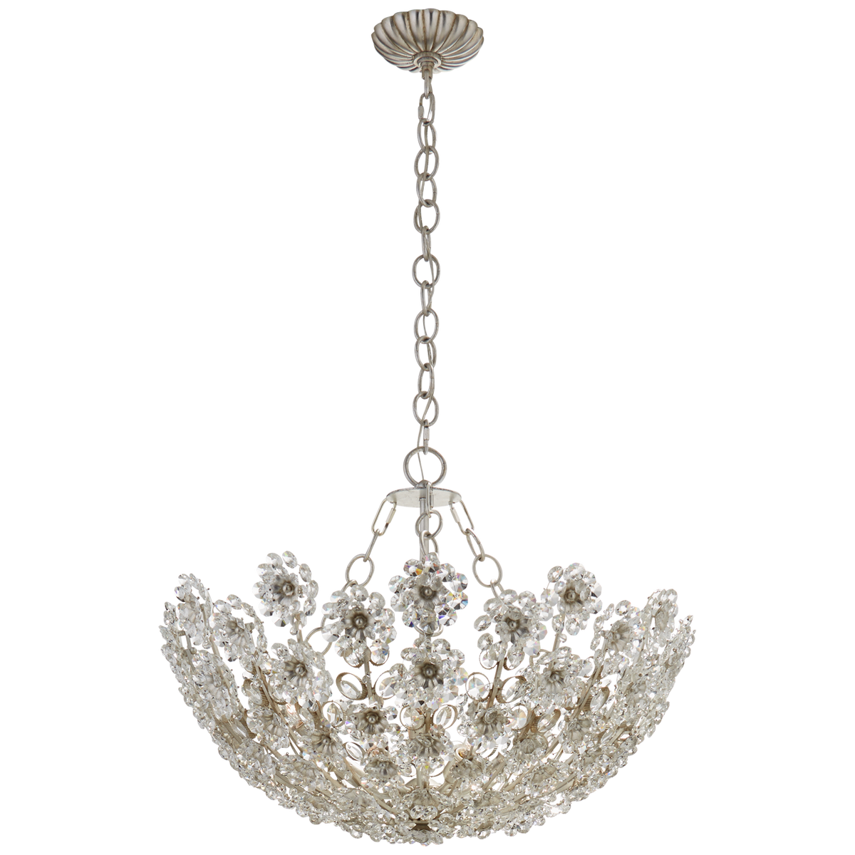 - The Aerin Claret Short chandelier is made of oxidized silver and finished with crystal. The lamp has a socket for an E 14 bulb.