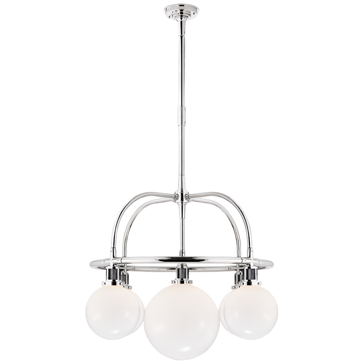 The McCarren chandelier by Ralph Lauren Home is made of polished nickel with white glass. The chandelier has sockets for E 14 bulbs. Dimensions: 140.3 x 99.1 x 91.4 cm.