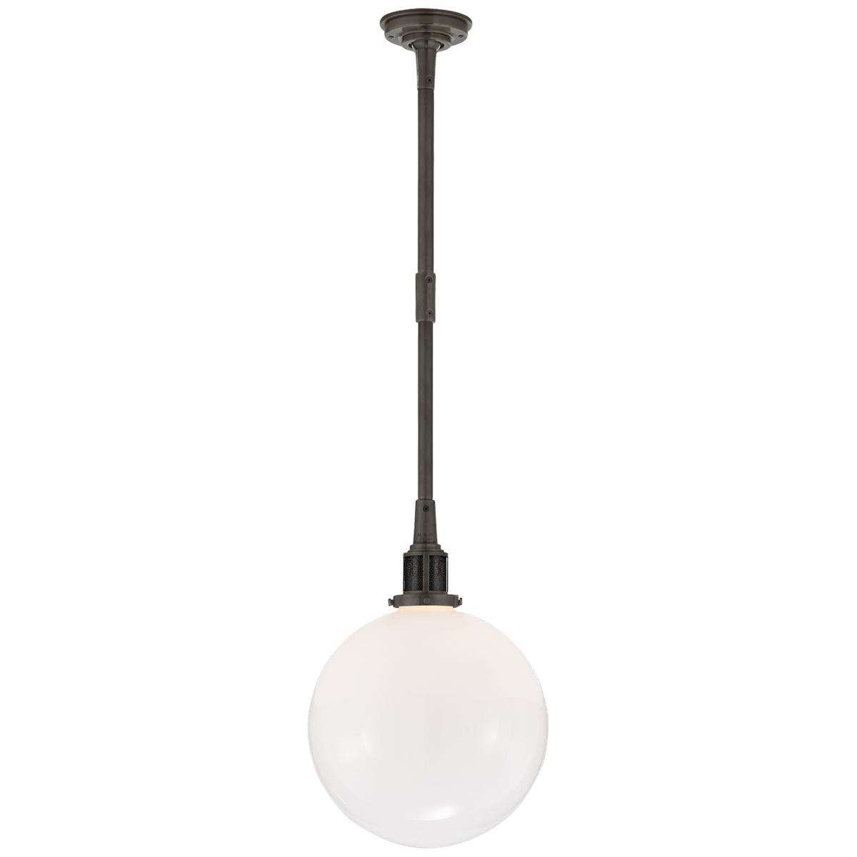 The McCarren Small hanging lamp by Ralph Lauren Home is made of bronze and finished with white glass. The lamp has a socket for an E 27 bulb. Dimensions: 118.1 x 66 x 30.5 cm.