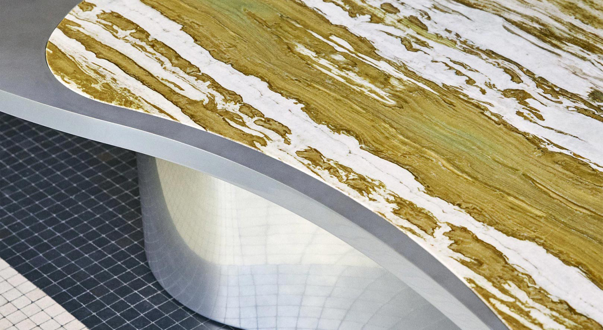 • Antibes coffee table by Monography with a metallic base and a marble top. The product is available in various sizes and finishes.