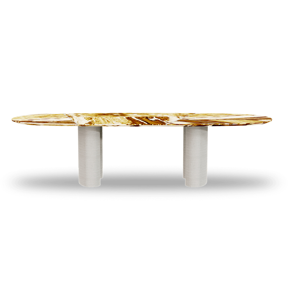 - The Cartesio table by Monography in its basic version, finished with a metal base and a stone top. The product is available in various sizes and finishes.