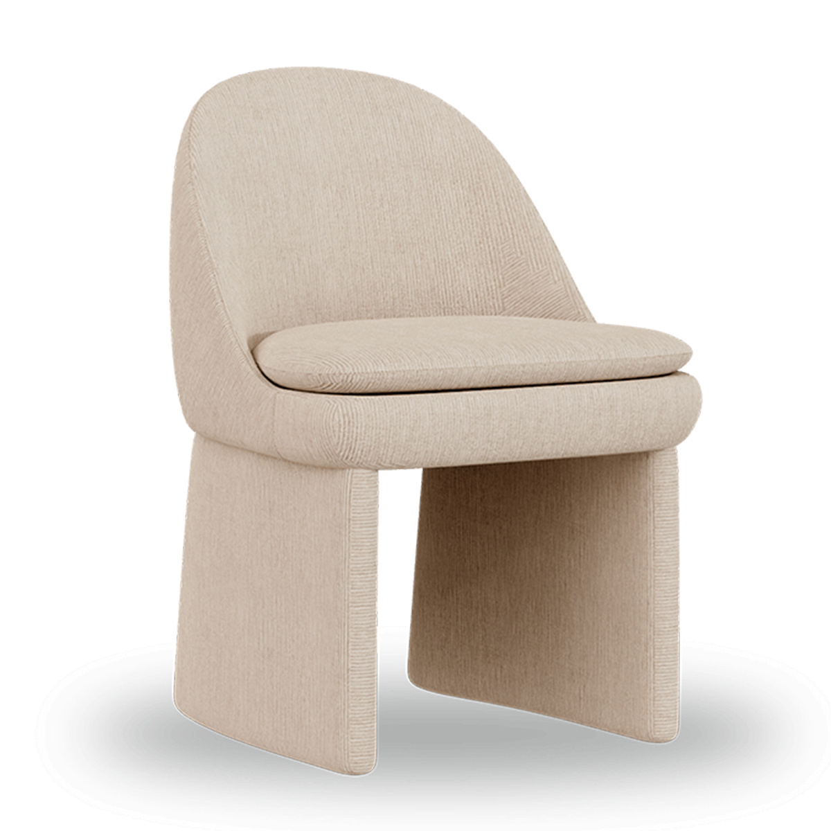 - The Maxime chair by Monography in its basic version, finished with fabric and a lacquered wooden base. Filling: polyurethane foam. The product is available in various finishes.