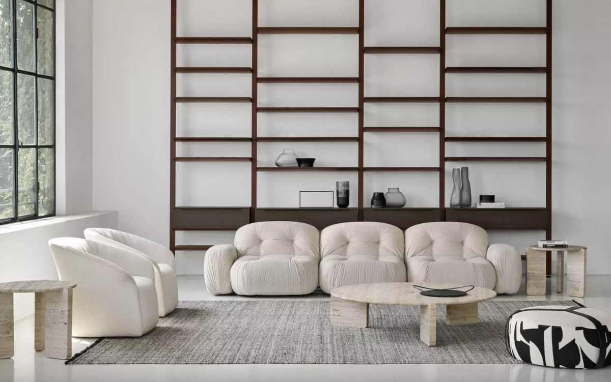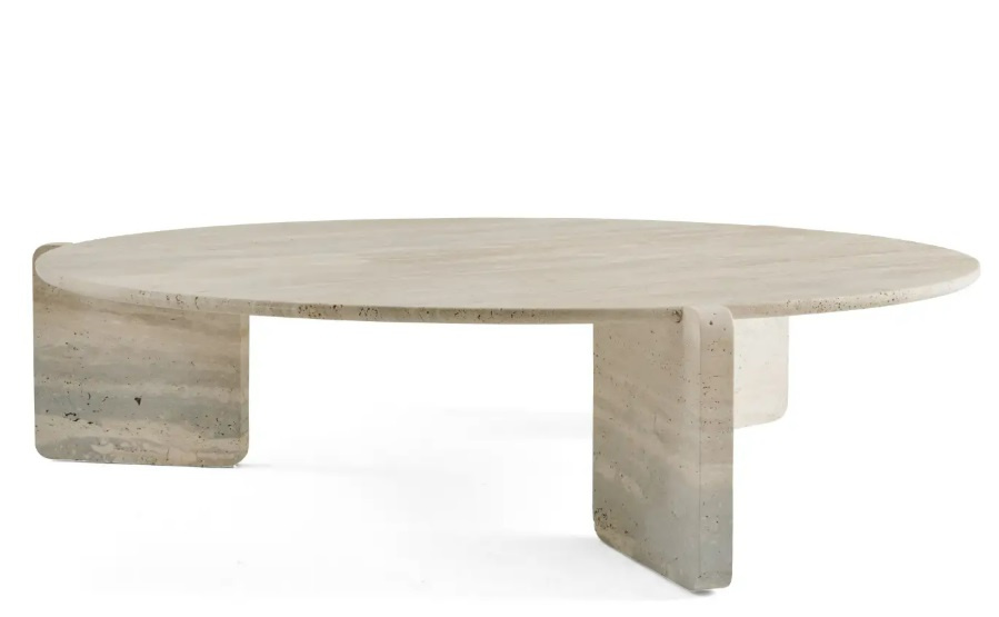 - Greenwich table by Gianfranco Ferré Home, top and legs made of Travertino marble. The lower part of the top made of metal with an ivory matt finish.