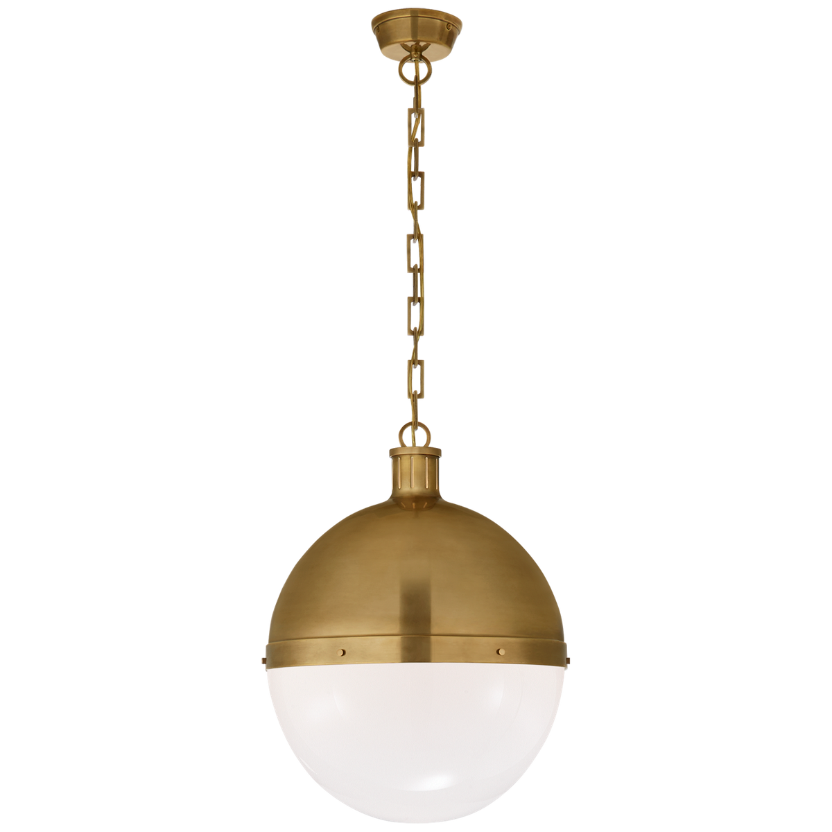 - The Hicks hanging lamp by Thomas O'Brien is made of brass and finished with a white glass lampshade. The lamp has a socket for an E 27 bulb.