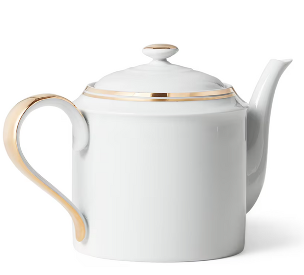 • Wilshire Teapot. Elegant and timeless, the Wilshire teapot is crafted with porcelain and detailed with glossy accent bands of 24K gold or silver-hued platinum.