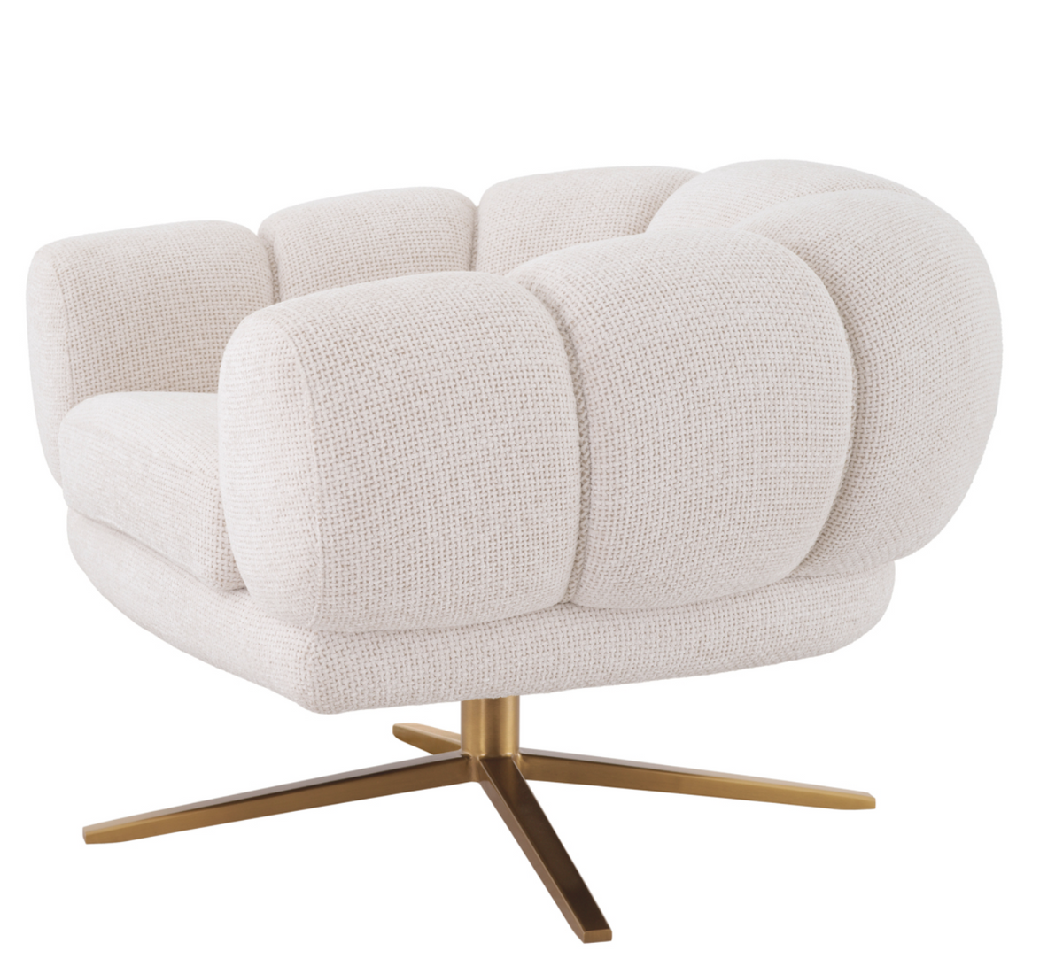 - Sunset swivel armchair by Eichholtz is made of Lyssa off-white fabric and finished with a brushed brass base.