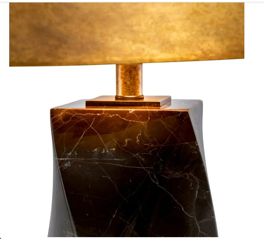 • The vintage-style Camelia table lamp by Eichholtz is finished with a solid black marble base and a brass shade.
