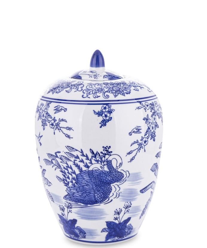 - The Blue Swan ceramic vase is a unique piece inspired by classic Far Eastern porcelain. The white ceramic, decorated with a navy blue swan and floral motif, gives it elegance and a timeless character.