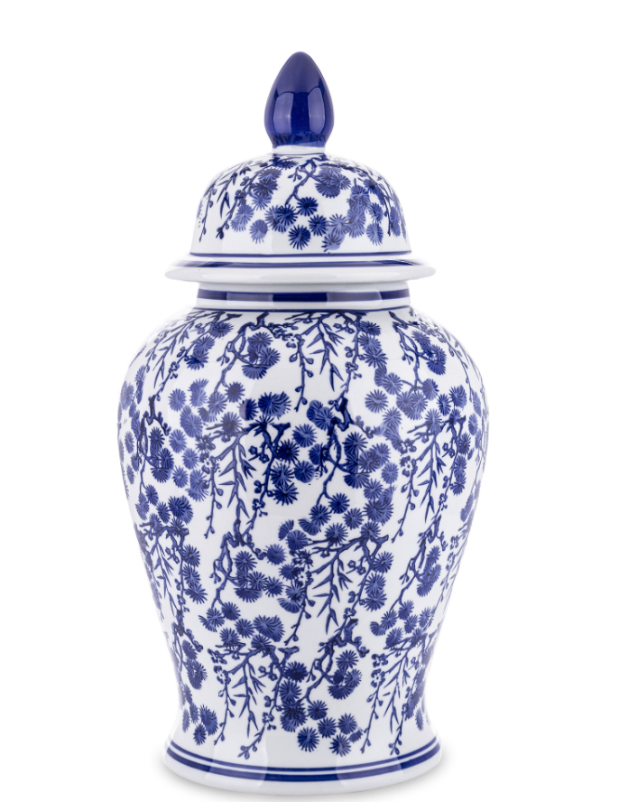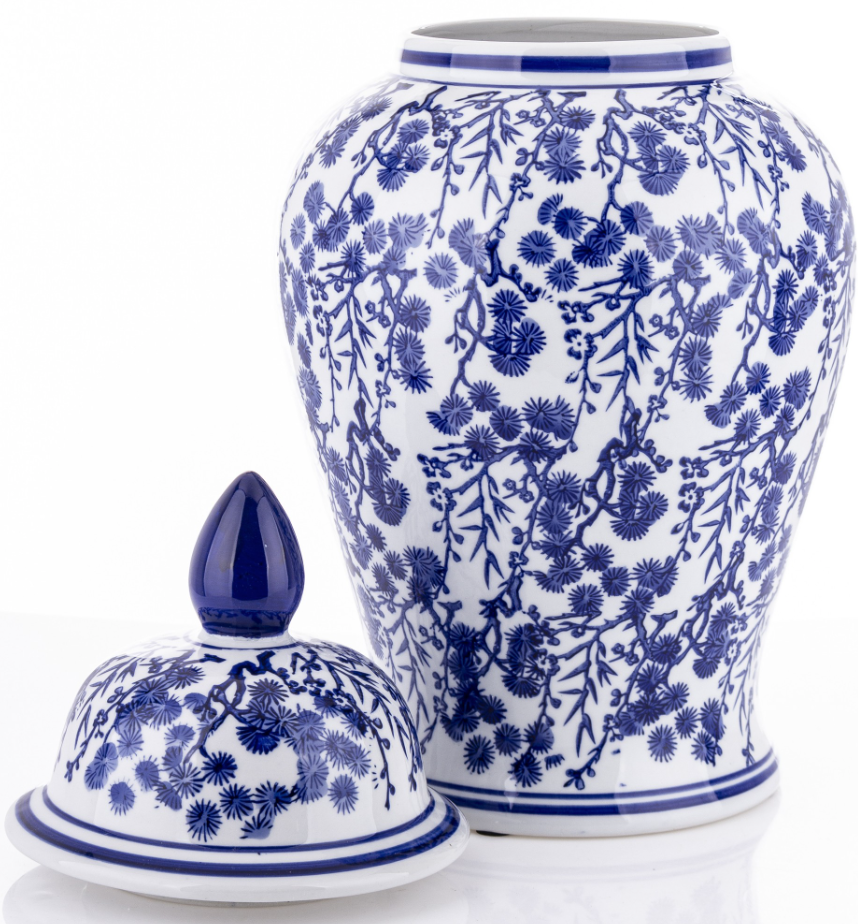 - The Blue Blossom Vase captivates with its delicate blue floral motif and flowing branches inspired by oriental porcelain. The white ceramic and harmonious pattern create an elegant accent for both classic and modern interiors. Dimensions: 47 x 23 x 23 cm