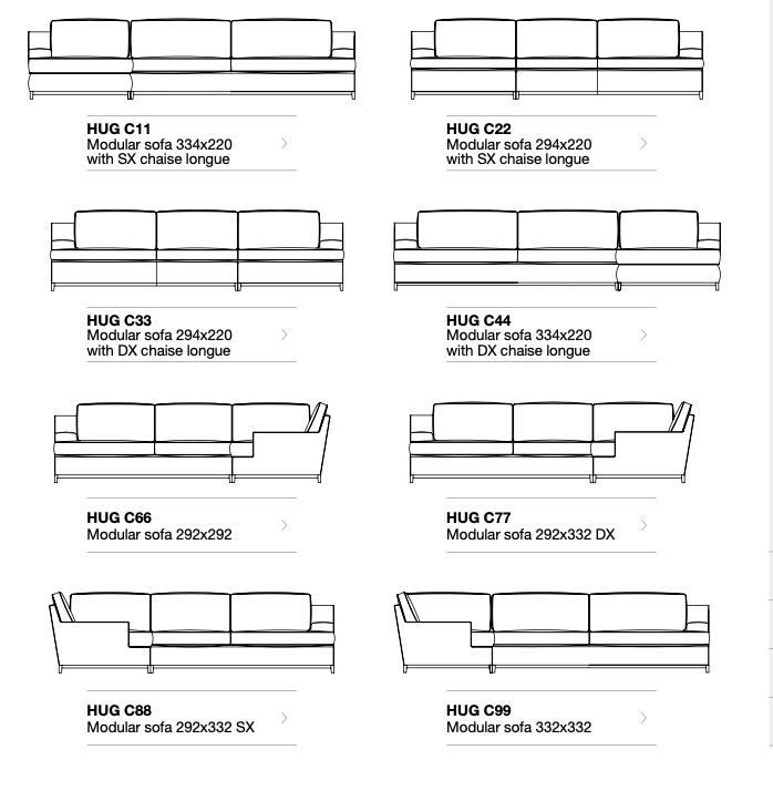 - The Hugo modular sofa, by Galimberti Nino, is made of solid wood, soft cushions and minimalist accents make this collection an essential piece for any interior.