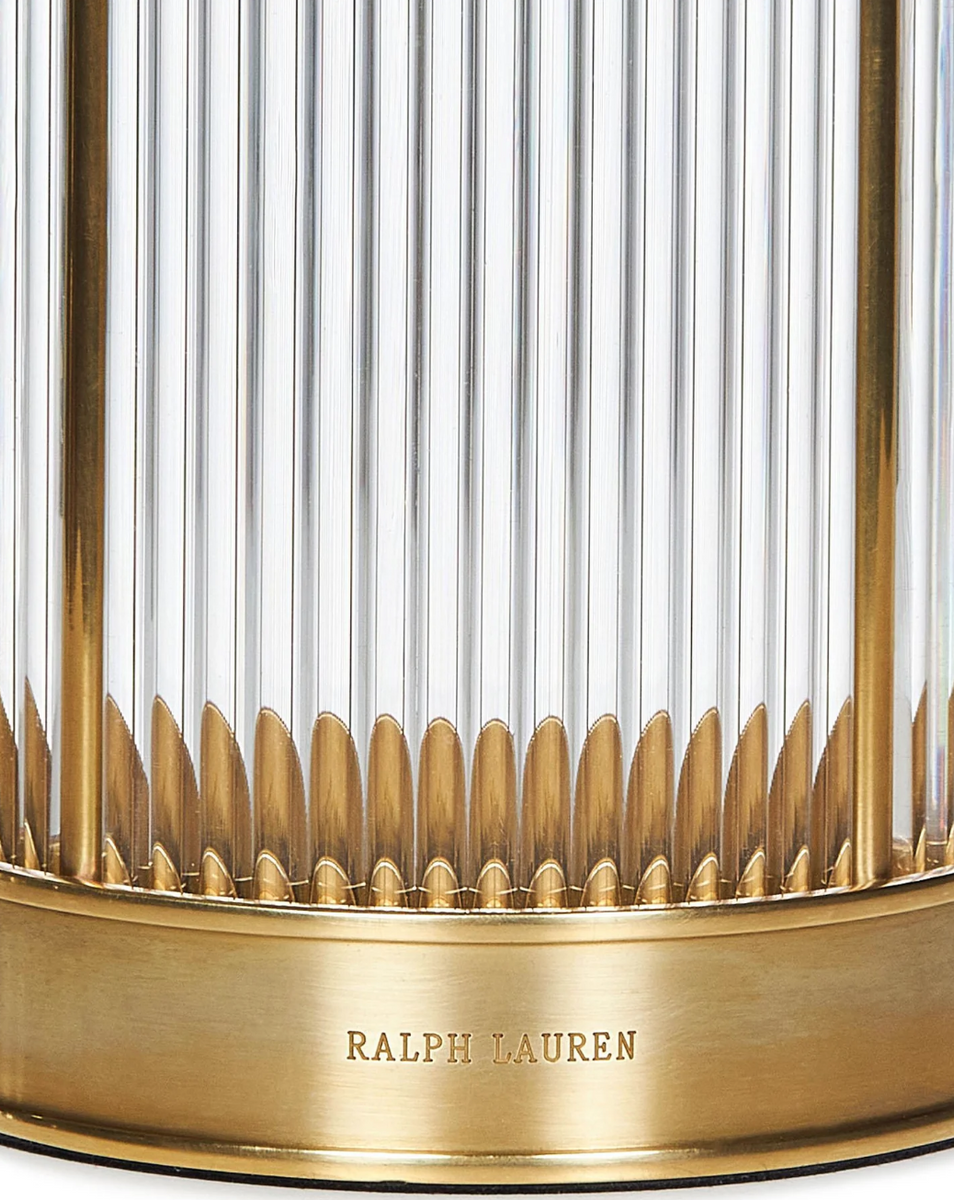 - Ralph Lauren Home, Allen Hurricane lantern in gold, with single glass rods and engraved logo.