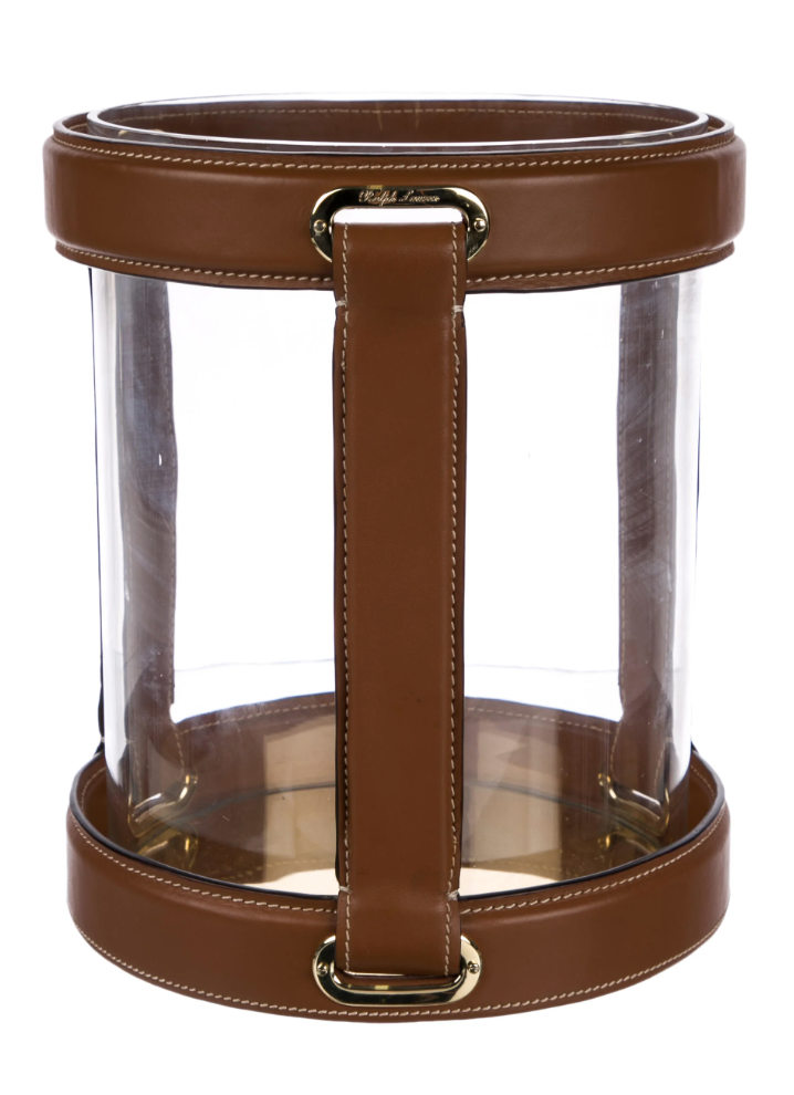 - Ralph Lauren Home, Riley Small lantern inspired by the Tiffin bag, with brass hardware and hand-stitched leather, epitomises the elegance and quality of RL. Material: glass, leather, brass.