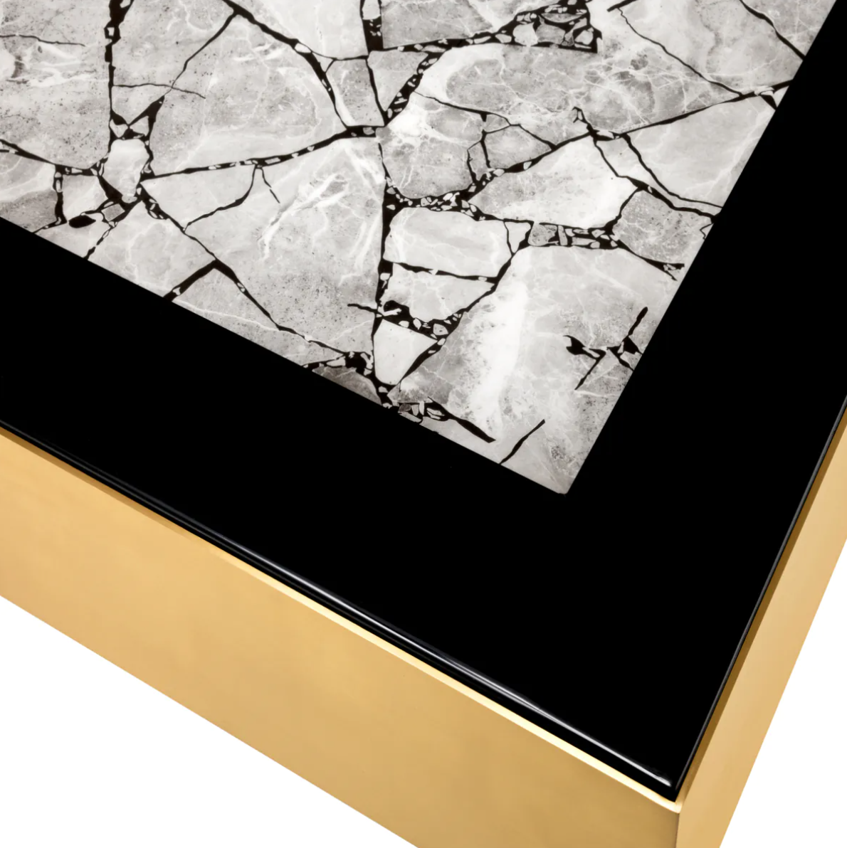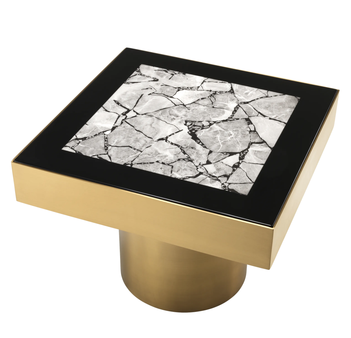 - Tatler side table by Eichholtz, based on a solid round base in brushed brass finish. The square high gloss black top conceals inserts in artificial marble.