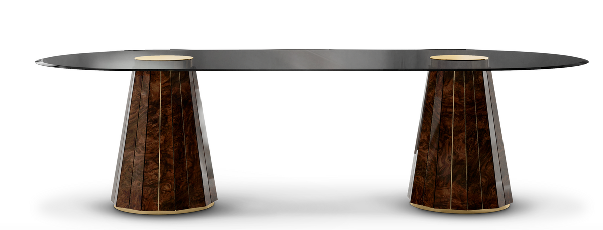 - The Darian Oval dining table by Luxxu, made of walnut with metal details, features a smoked tempered glass top.