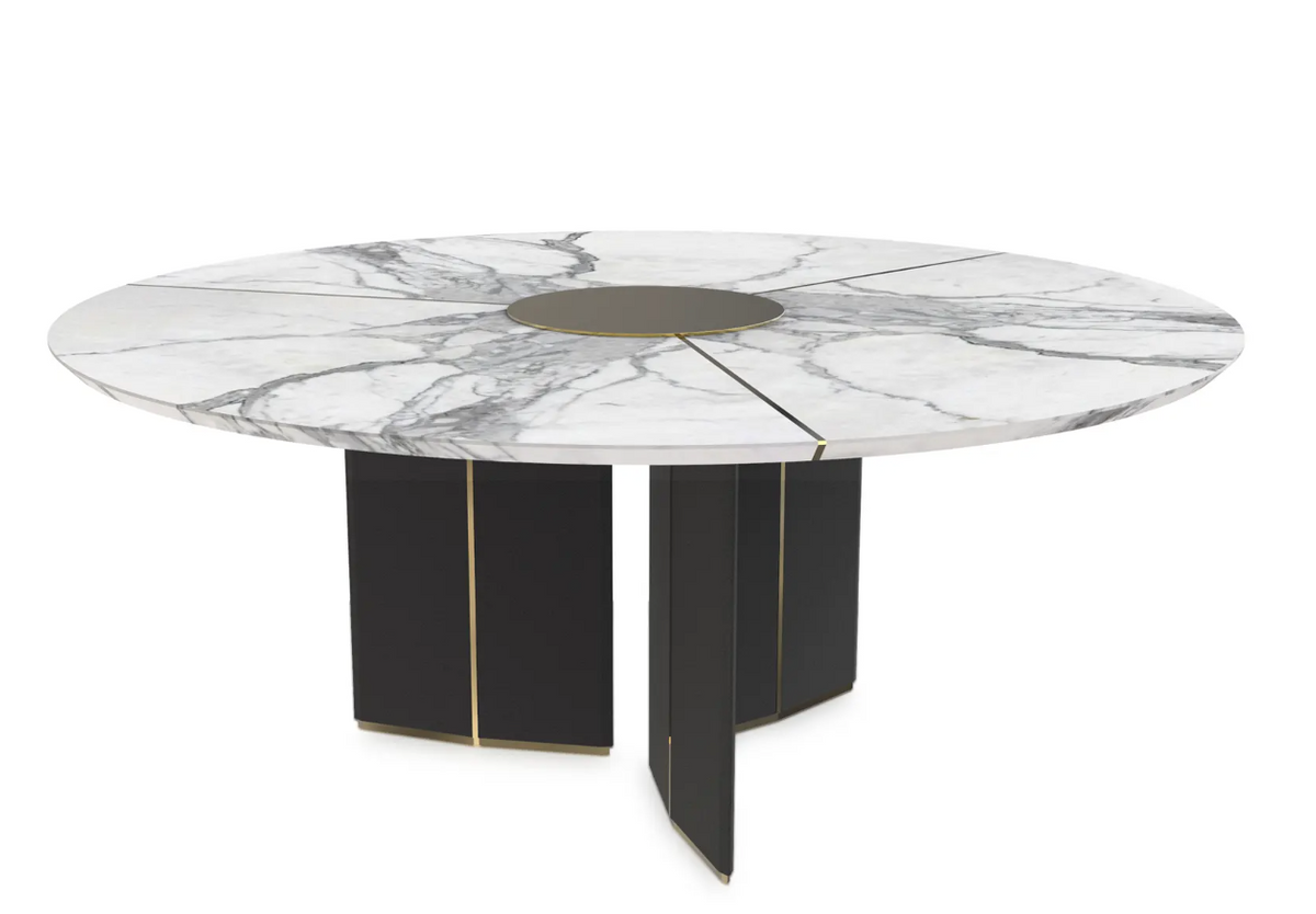 - The Algerone dining table by Luxxu features a round Carrara marble top supported on an elegant base decorated with black leather and polished brass details.