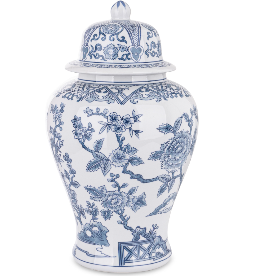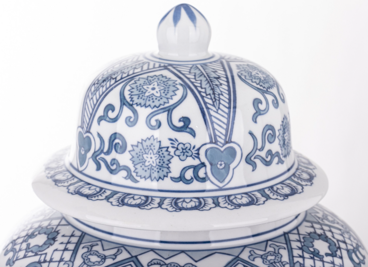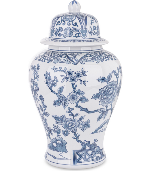 - The Blue Imperial Garden ceramic vase features an elegant design inspired by classic chinoiserie porcelain. The white ceramic, richly decorated with blue floral motifs, branches, and architectural details, lends it a refined character.