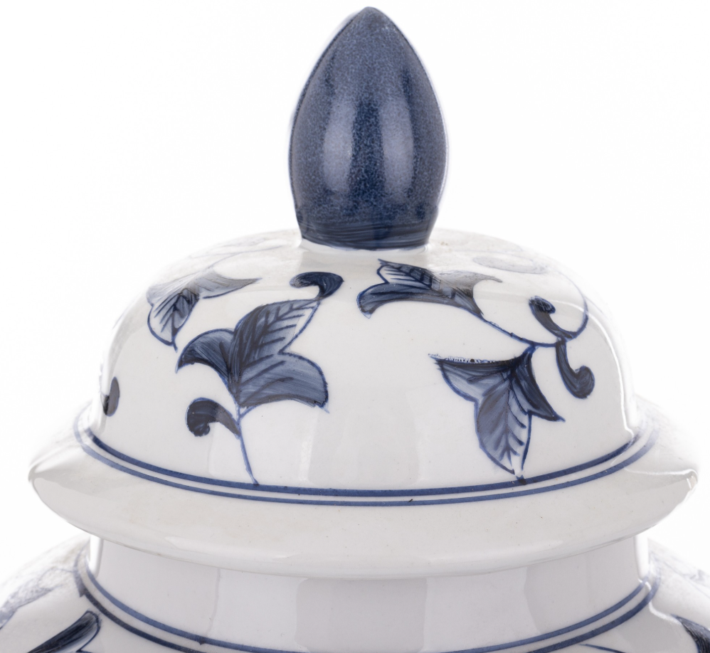 The Blue Scroll Elegance ceramic vase is a harmonious combination of white ceramic and a subtle navy blue floral ornament. Its classic form and delicate pattern give it timeless elegance. Dimensions: 36 x 21 x 21 cm
