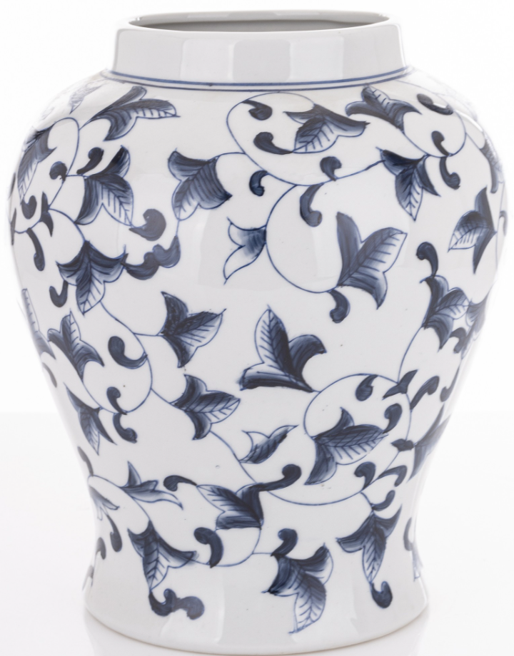 - The Blue Scroll Elegance ceramic vase is a harmonious combination of white ceramic and a subtle navy blue floral ornament. Its classic form and delicate pattern give it timeless elegance.
