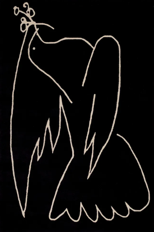 - The Piccione rug by Eichholtz, hand tufted in New Zealand wool, in black and white, depicts a white dove with an olive branch in its beak.
