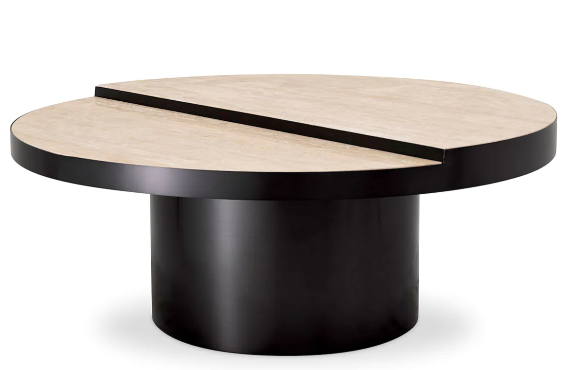 The Excelsior coffee table by Eichholtz, has a brown finish and a travertine top that is made of two semi-circular panels, one part is slightly raised from the other part. Dimensions: ø 88 x 35 cm.