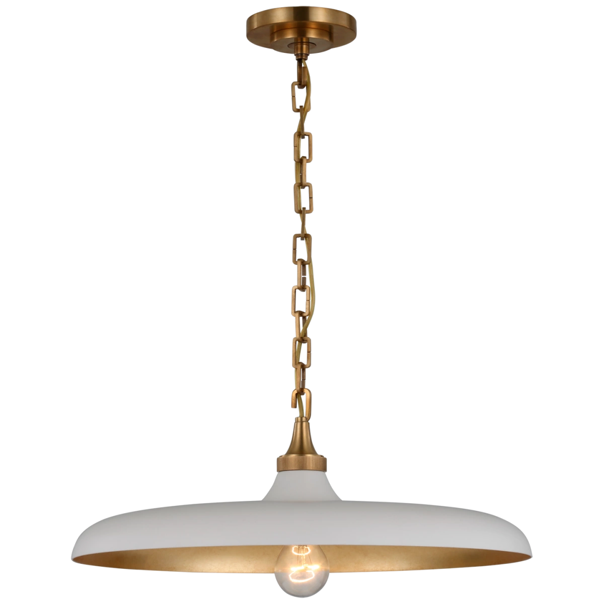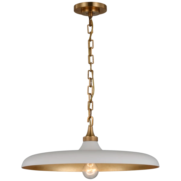 The Piatto Medium pendant lamp designed by Thomas O'Brien by Visual Comfort in hand-polished antique brass with a Plaster Whit shade, features rustic gilding on the inside to reflect the light. Dimensions: h 183 x w 45.7 cm