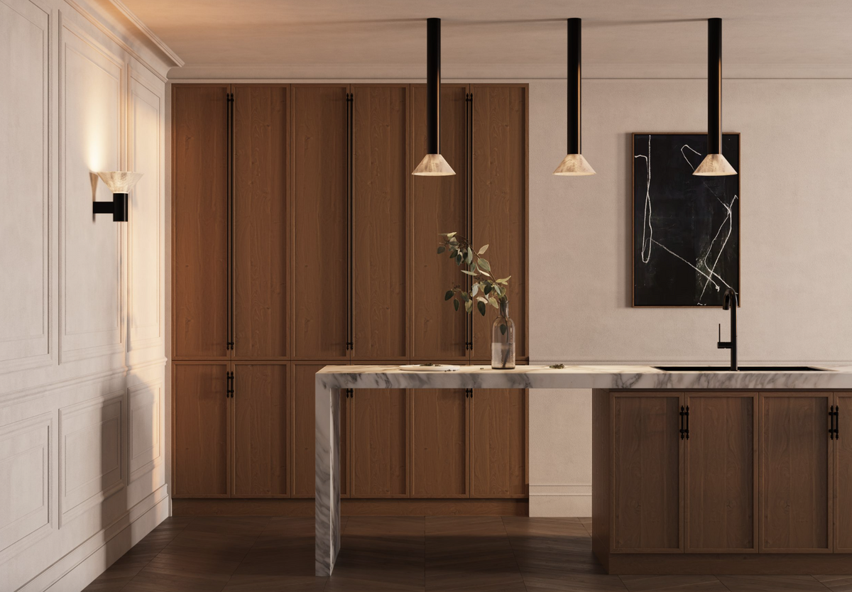• Torres wall lamp by CTO Lighting, features metal construction, handcrafted and alabaster-colored shade and polished nickel or bronze shade.