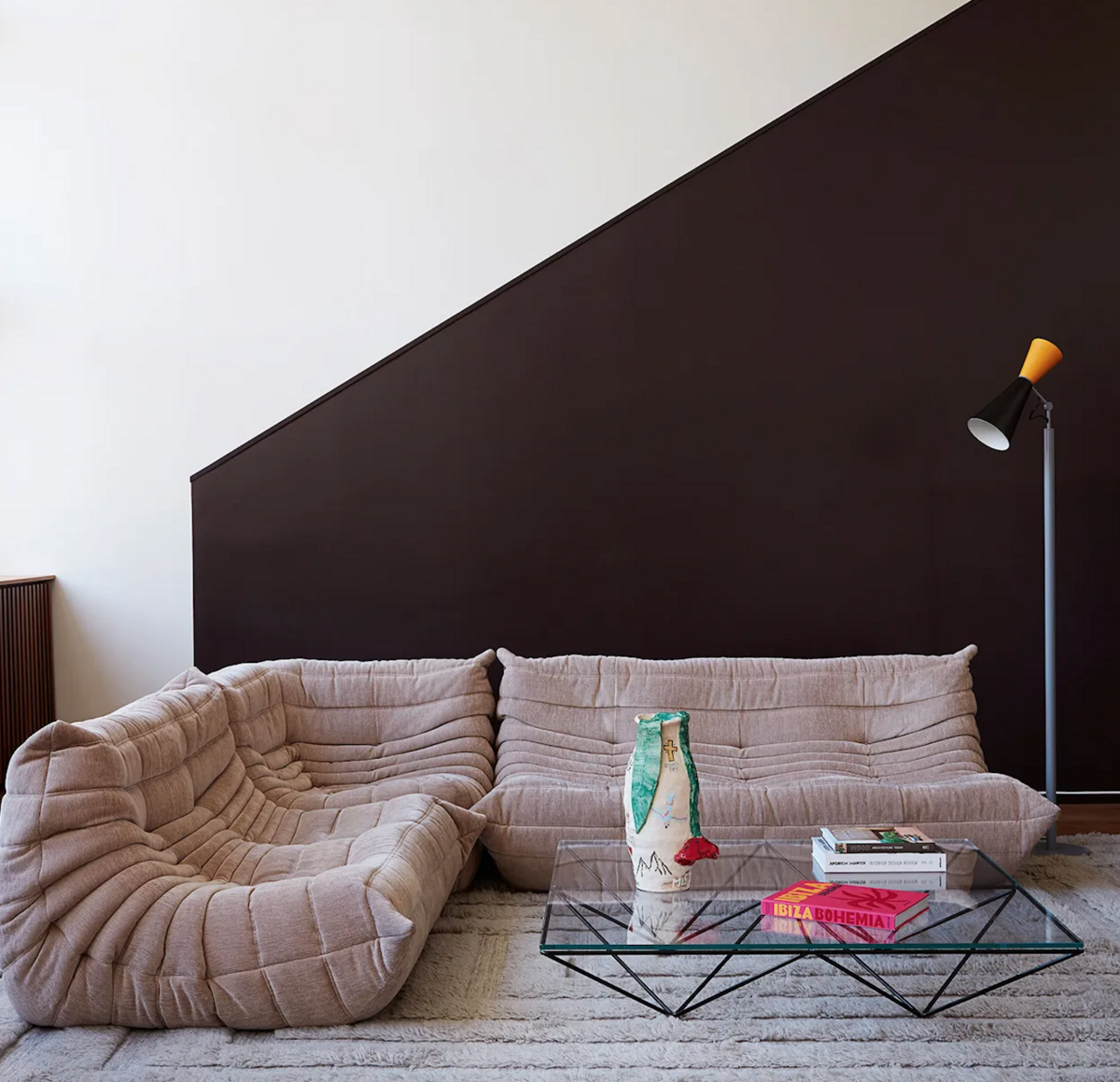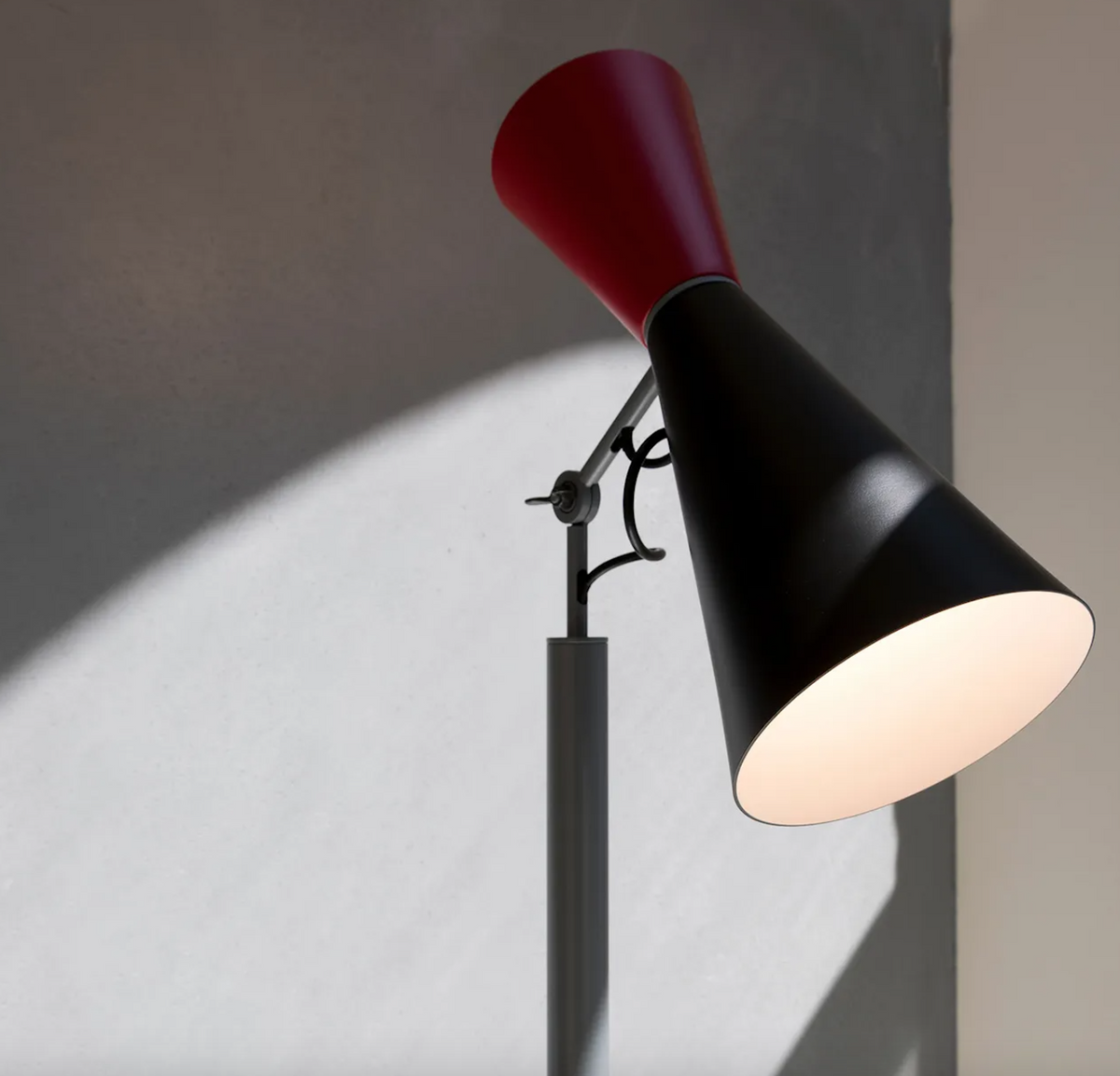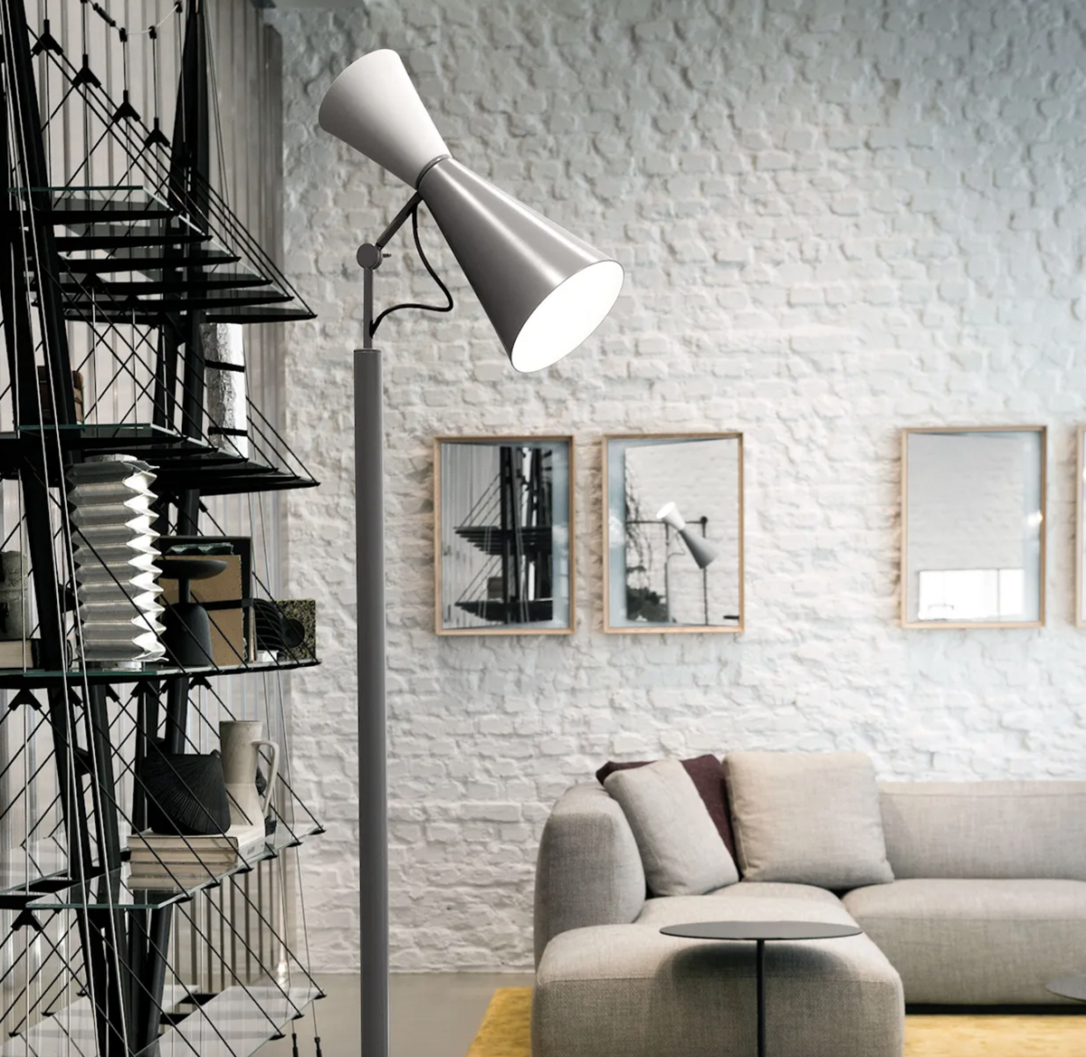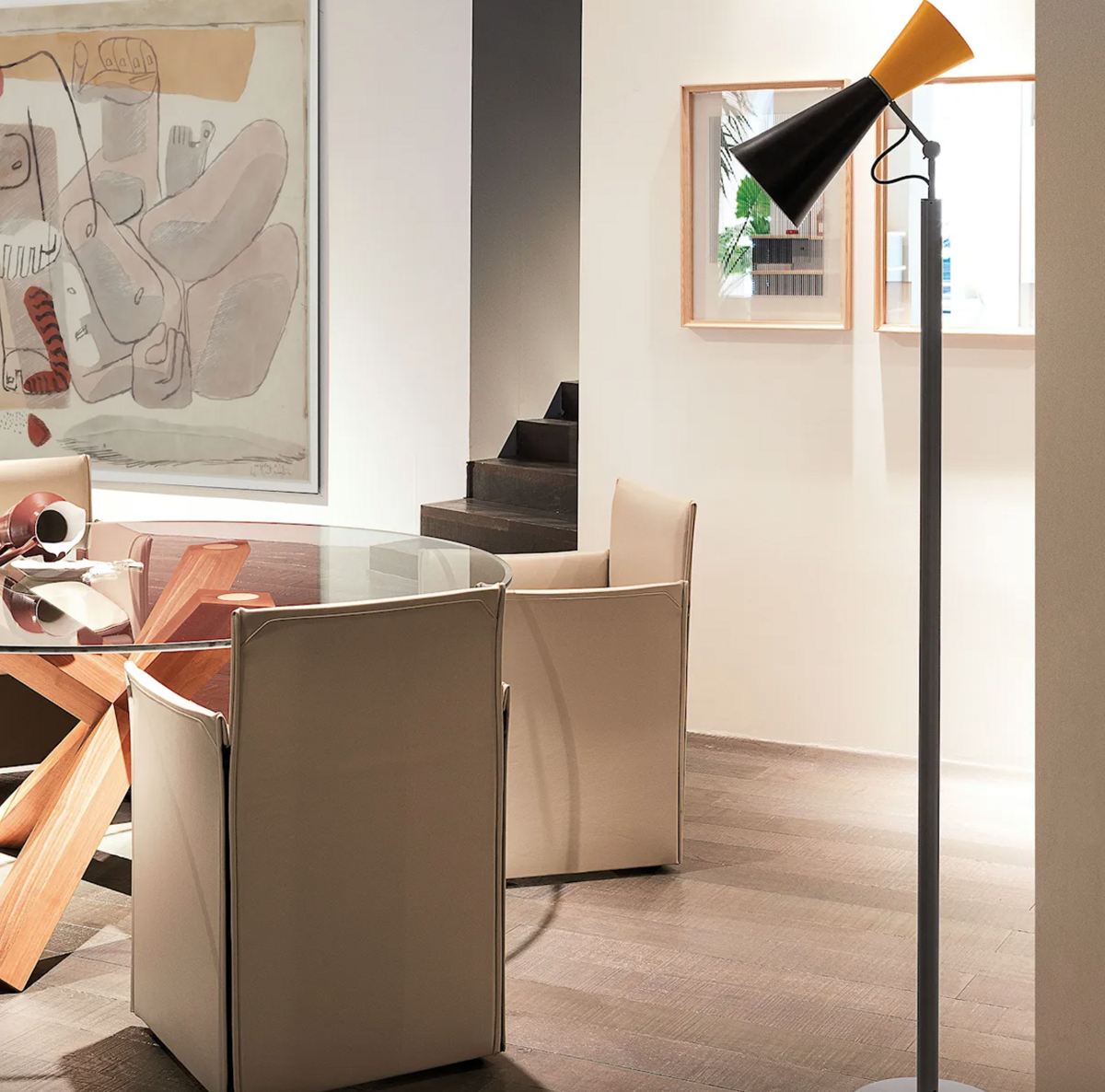 • Parliament floor lamp by Nemo Lighting made of aluminum with two opposite shades in two colors, the inner part of the shades in white. It has a matte gray base.