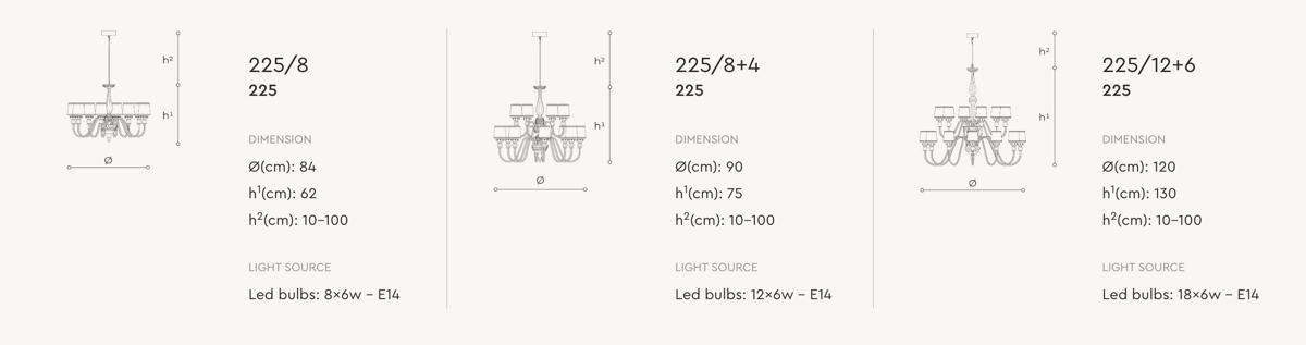 Quarzo 725/8+4 chandelier by Italamp lamp with metal construction in bright gold and chrome finish with hand-cut clear crystal diffusers. Available in various sizes.Dimming on request: Triac, Dali, Casambi. Dimension: 85 x 85 cm; H1: 41cm H2: 39 cm