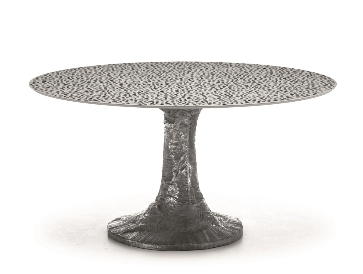 The Next 136 table by Gervasoni 1882, made entirely in polished cast aluminium, in various finishes and heights. Available with a top in decorated HPL, marble or wood. Dimensions: base Ø 68 x top Ø 140 x height 75 cm