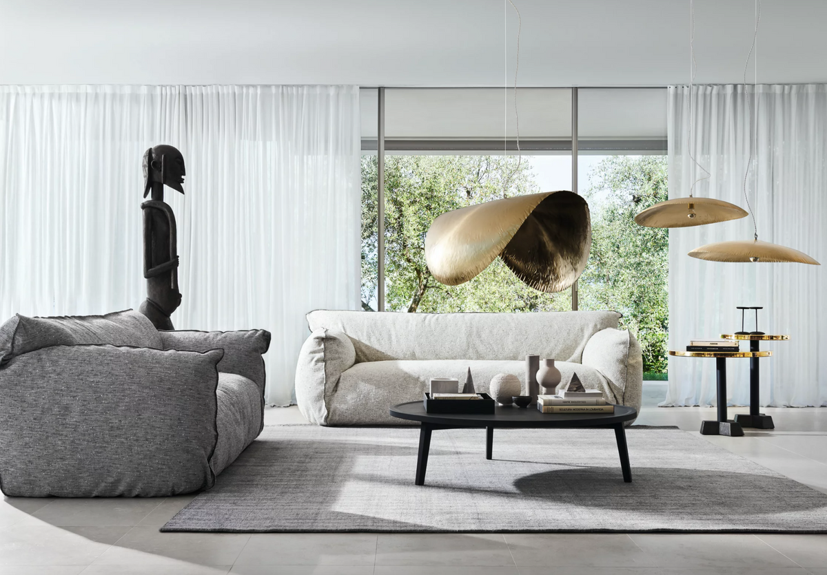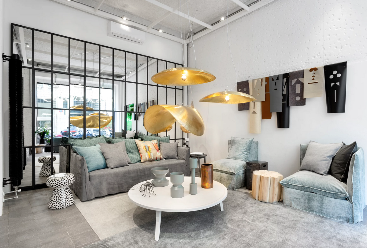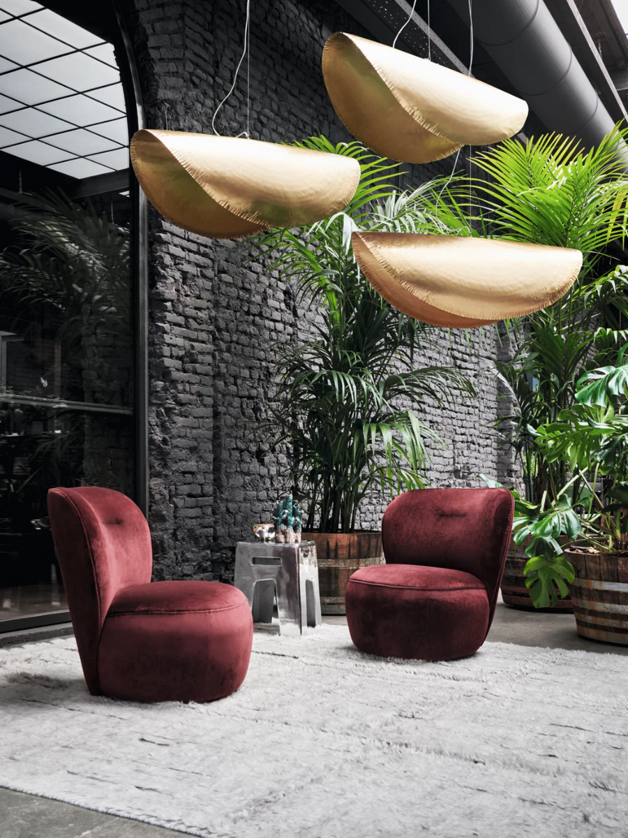 The Brass 96 pendant lamp by Gervasoni 1882, features a light brass disc with a slight curve in a smaller or larger, version. It can be used individually or combined together.