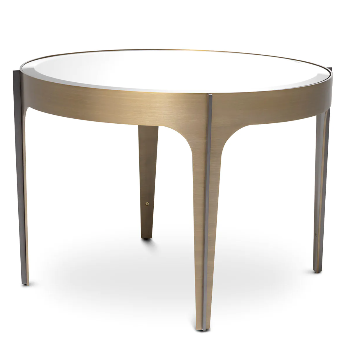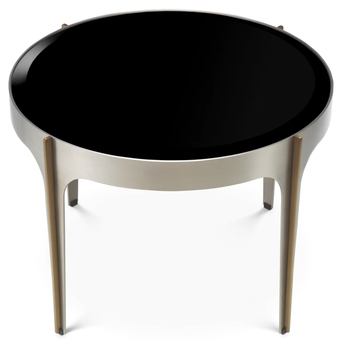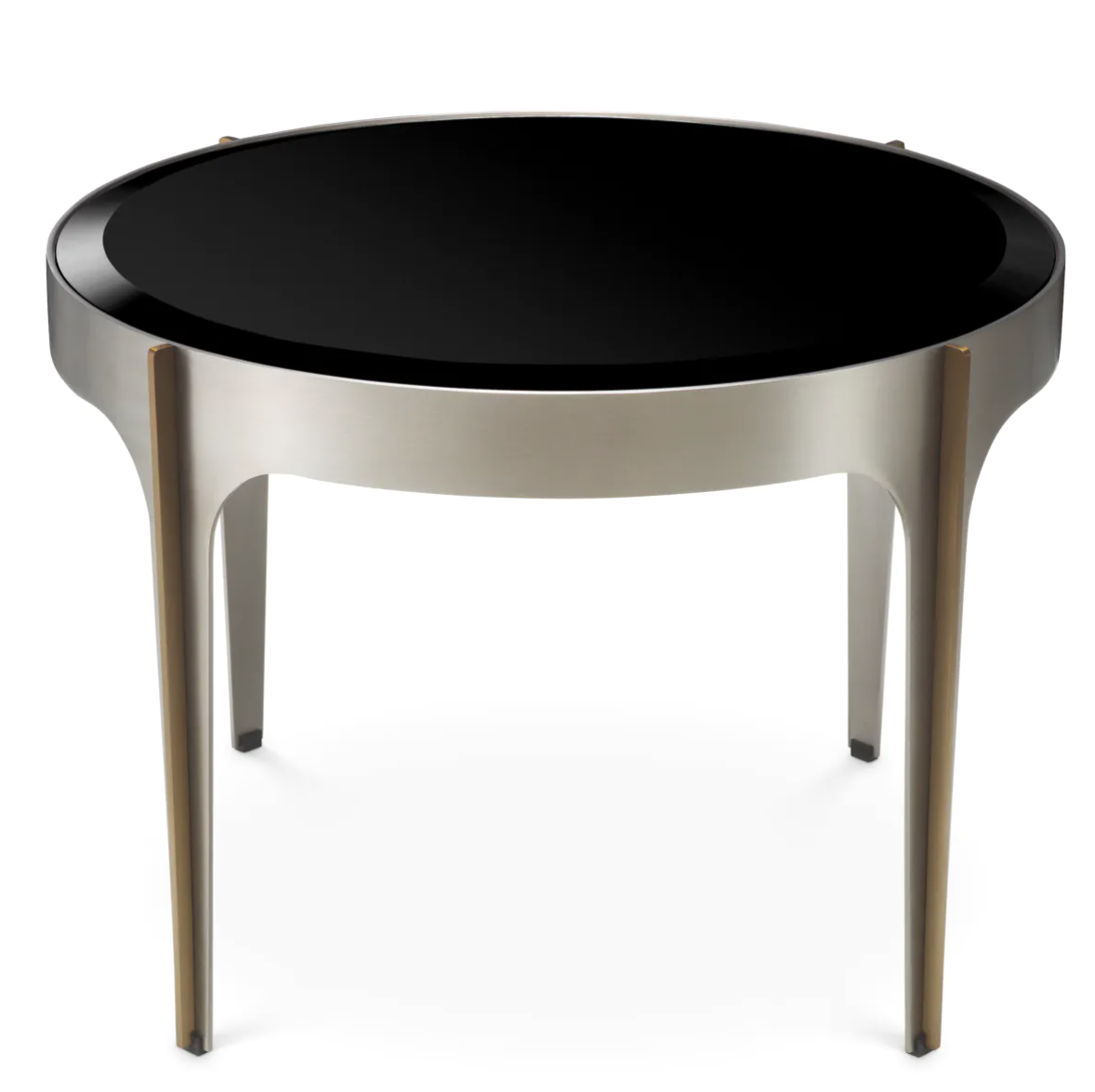- Artemisa side table by Eichholtz, the brushed steel and brass finish blends seamlessly with the elegant black bevelled glass top, exuding modern sophistication.