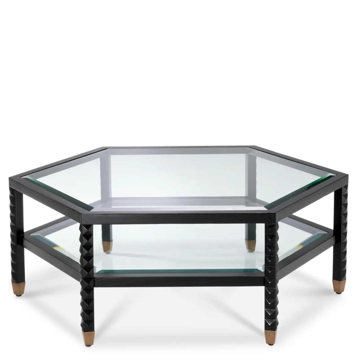 - Cornelius coffee table by Eichholtz, in a classic black finish and carved legs decorated with antique brass feet. Double layers of bevelled glass provide style and functionality.