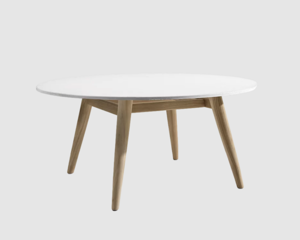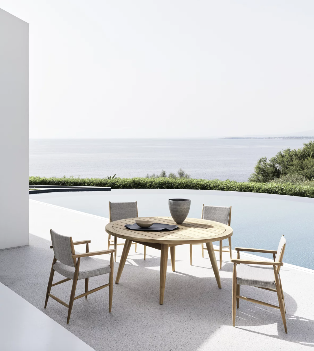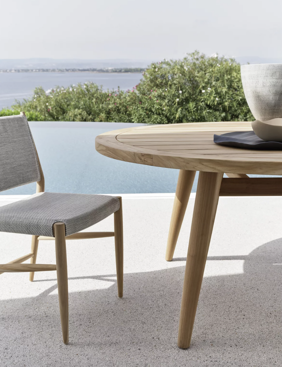 The Eidos 136 table by Gervasoni 1882, made of teak with a slatted top, also available with a pearl-colored concrete top or a textured, back-painted Slate Grey glass top. Ideal for outdoor spaces. Dimensions: top Ø 160 x H 73 cm