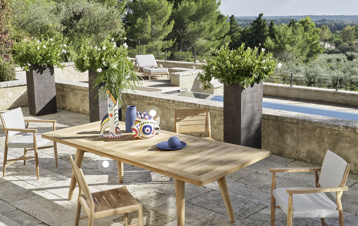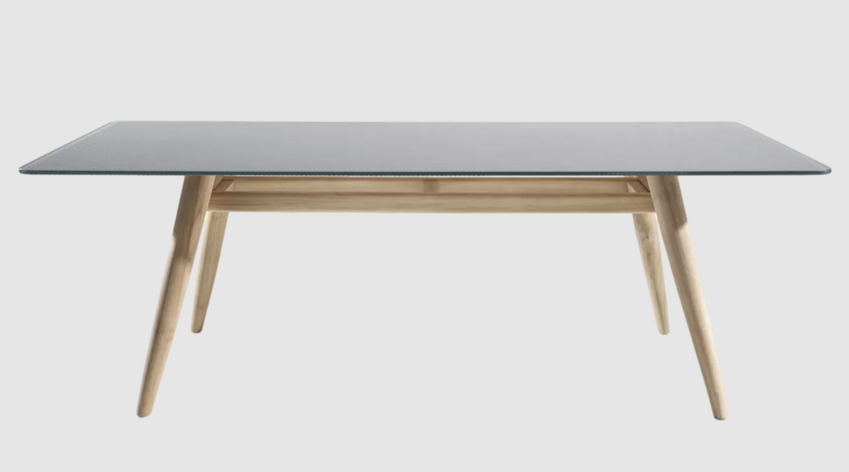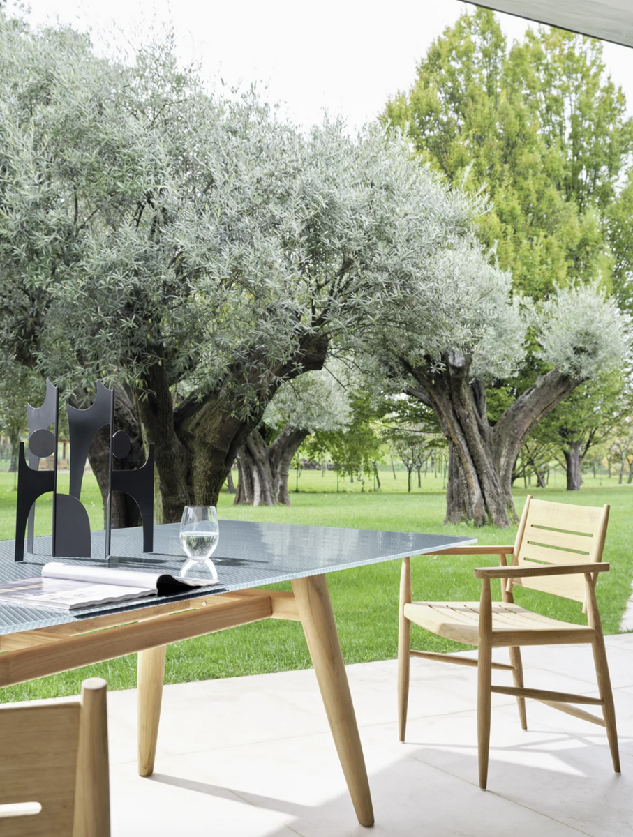 - The Eidos table by Gervasoni 1882, made of teak with a slatted top, is also available with a concrete top in Pearl or a textured, back-painted Slate Grey glass top.
