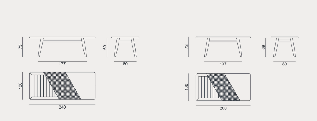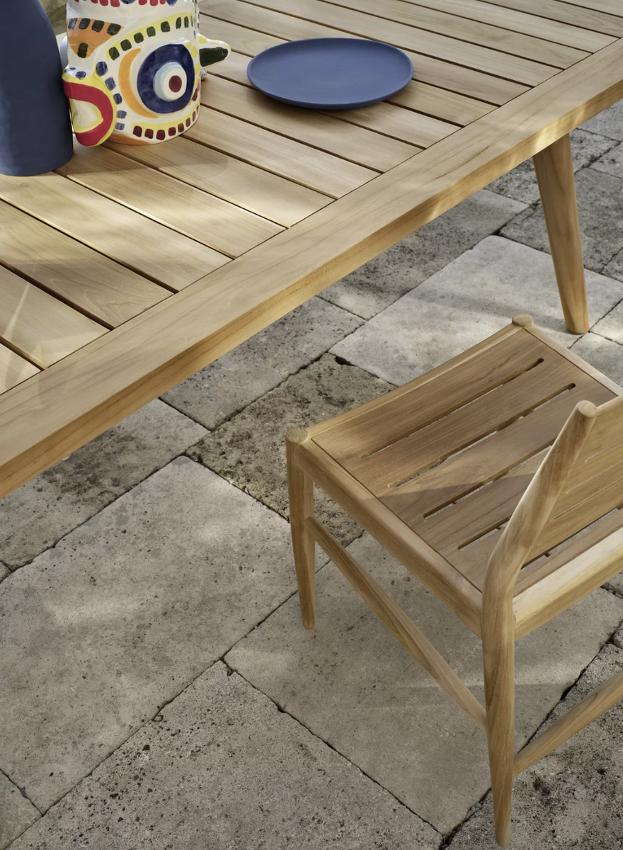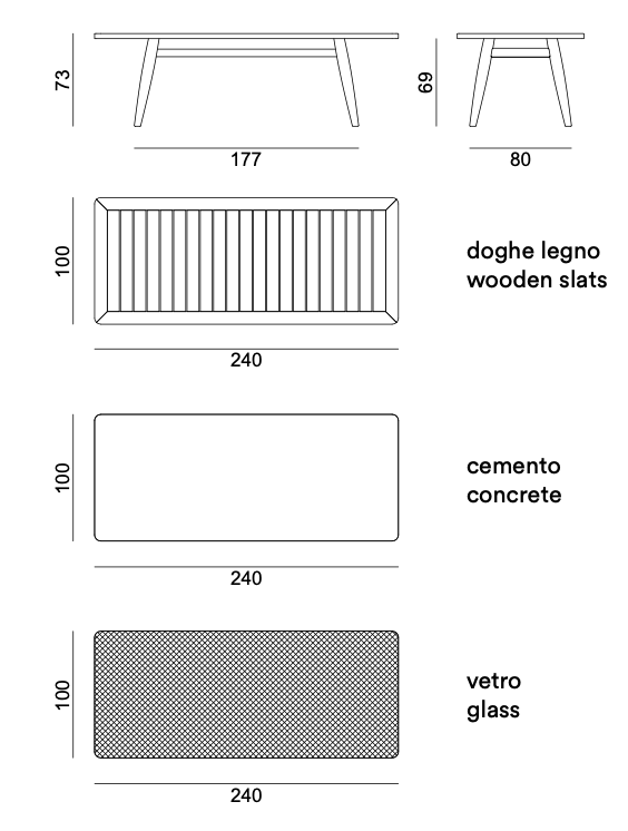 The Eidos table by Gervasoni 1882, made of teak with a slatted top, is also available with a concrete top in Pearl or a textured, back-painted Slate Grey glass top. Available in two sizes. Dimensions: width 80 x length 177 x height 73 cm.