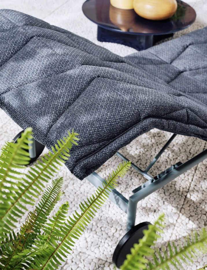 • Flair reclining lounger by Gervasoni 1882, has a tubular aluminum frame with embossing, in pearl, oxido, agate, slate colors. Adjustable backrest, removable cover with quilted fabric.